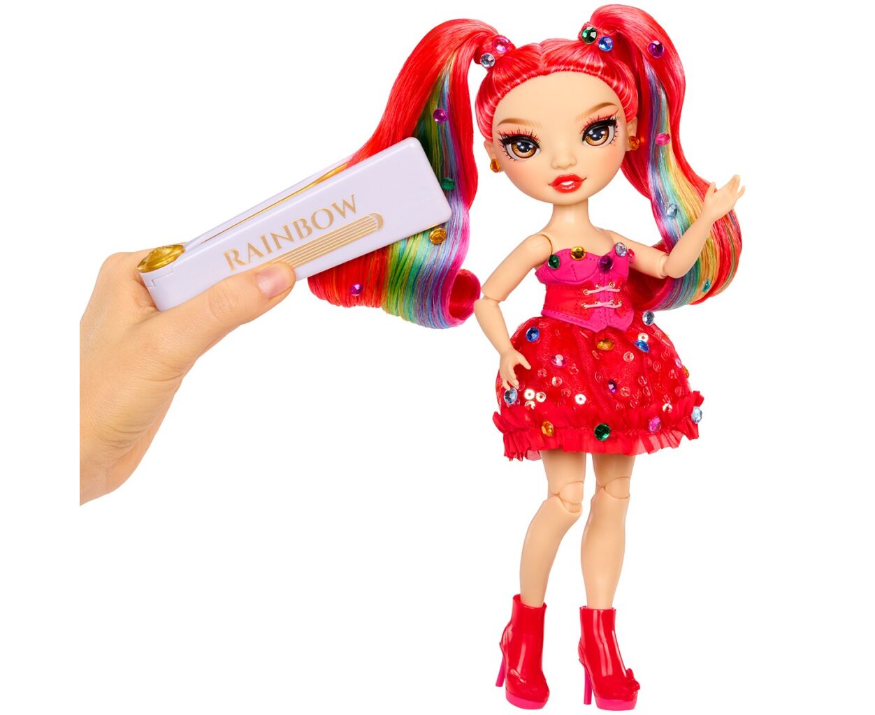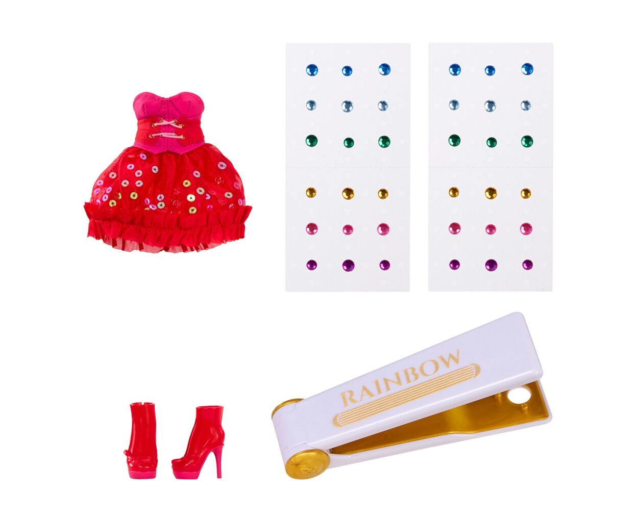 - Лялька, комплект одягу, пара взуття, 2 аркуші наліпок з камінцями, щипці для волосся, інструкція