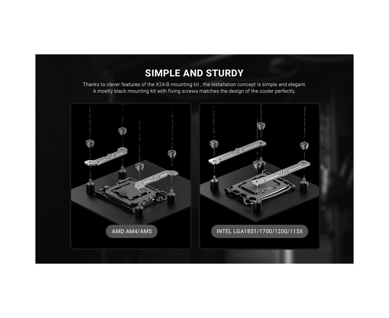 Для процесорів - INTEL, AMD, сокет - AM4, AM5, 1150, 1151, 1155, 1156, 1200, 1700, 1851, матеріал радіатора - алюміній + мідь, діаметр вентиляторів - 120 мм, Максимальна частота обертів - 2000 об/хв, Тип підшипників - гідродинамічний (FDB Bearing), рівень шуму - 27.2 dB, роз'єми живлення - 3-pin, 4-pin, Підсвічування - ARGB