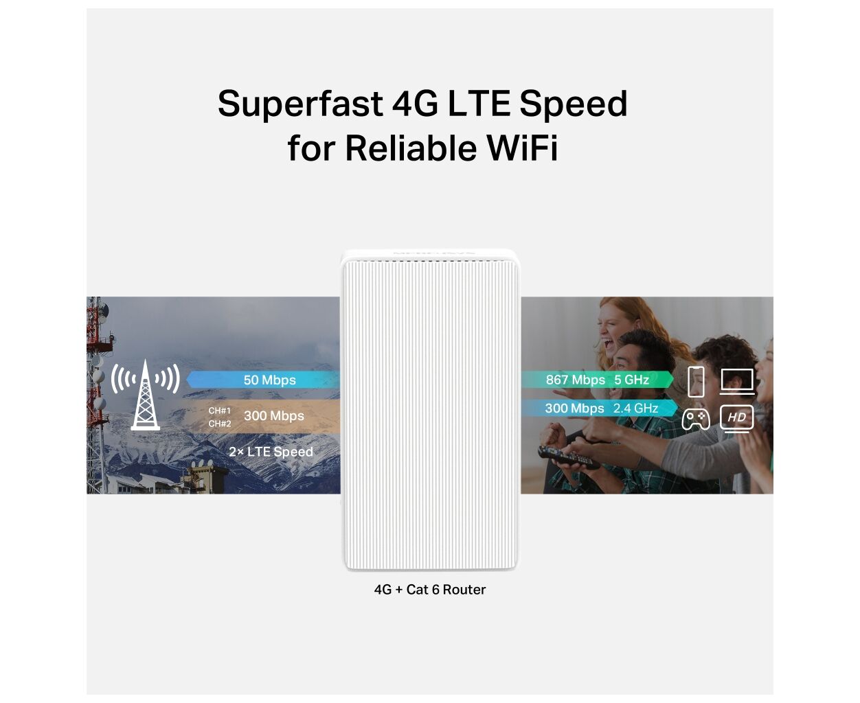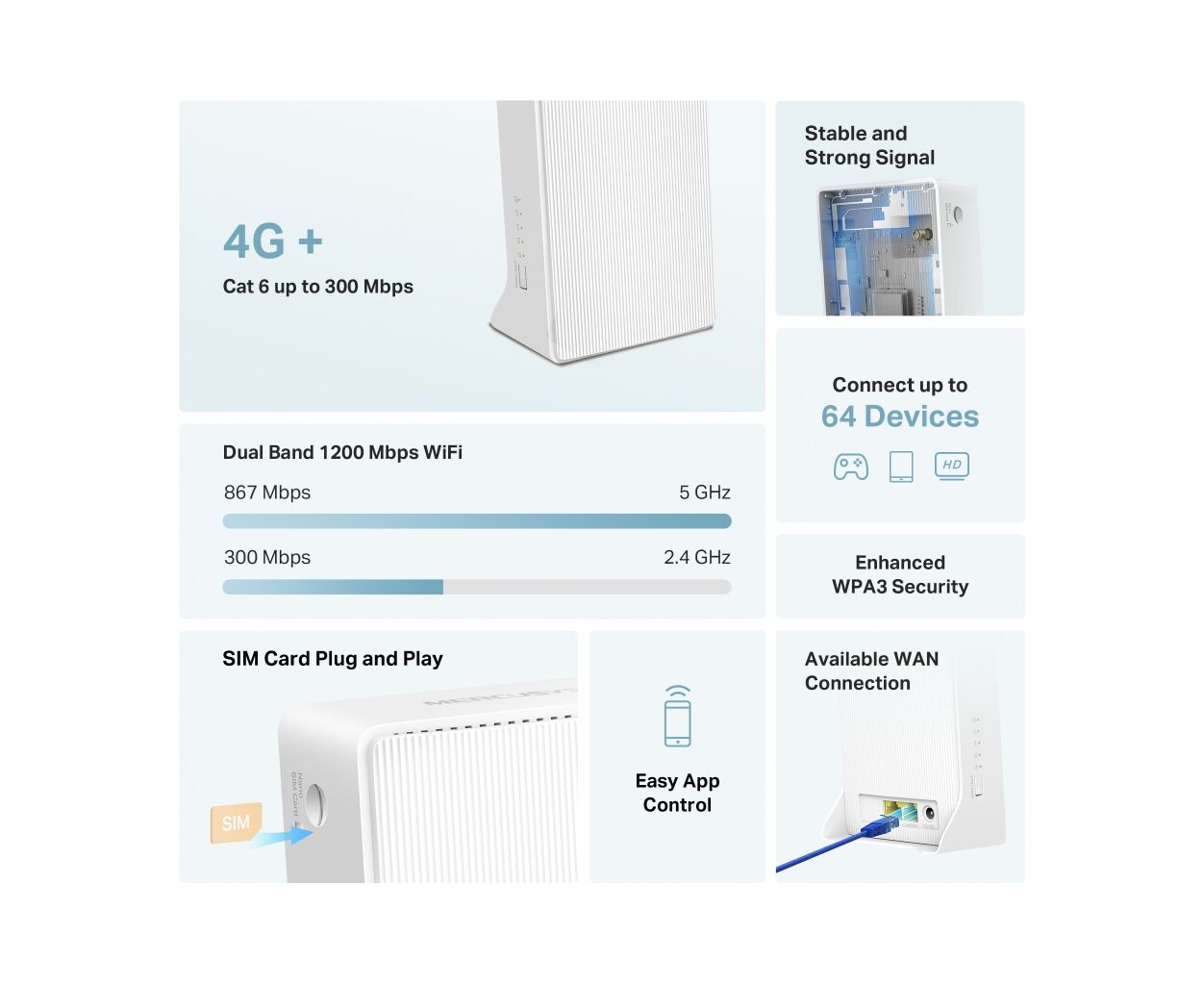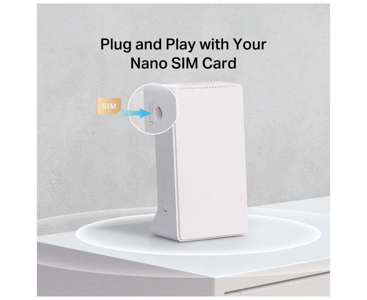 Маршрутизатор Mercusys MB230-4G — ідеальне рішення для сучасного дому. Він забезпечує блискавичну швидкість 4G+ Cat 6 до 300 Мбіт/с та підтримує дводіапазонний Wi-Fi до 1200 Мбіт/с: 867 Мбіт/с на 5 ГГц і 300 Мбіт/с на 2,4 ГГц. Все, що потрібно для підключення — це вставити Nano SIM-карту, без складних налаштувань.