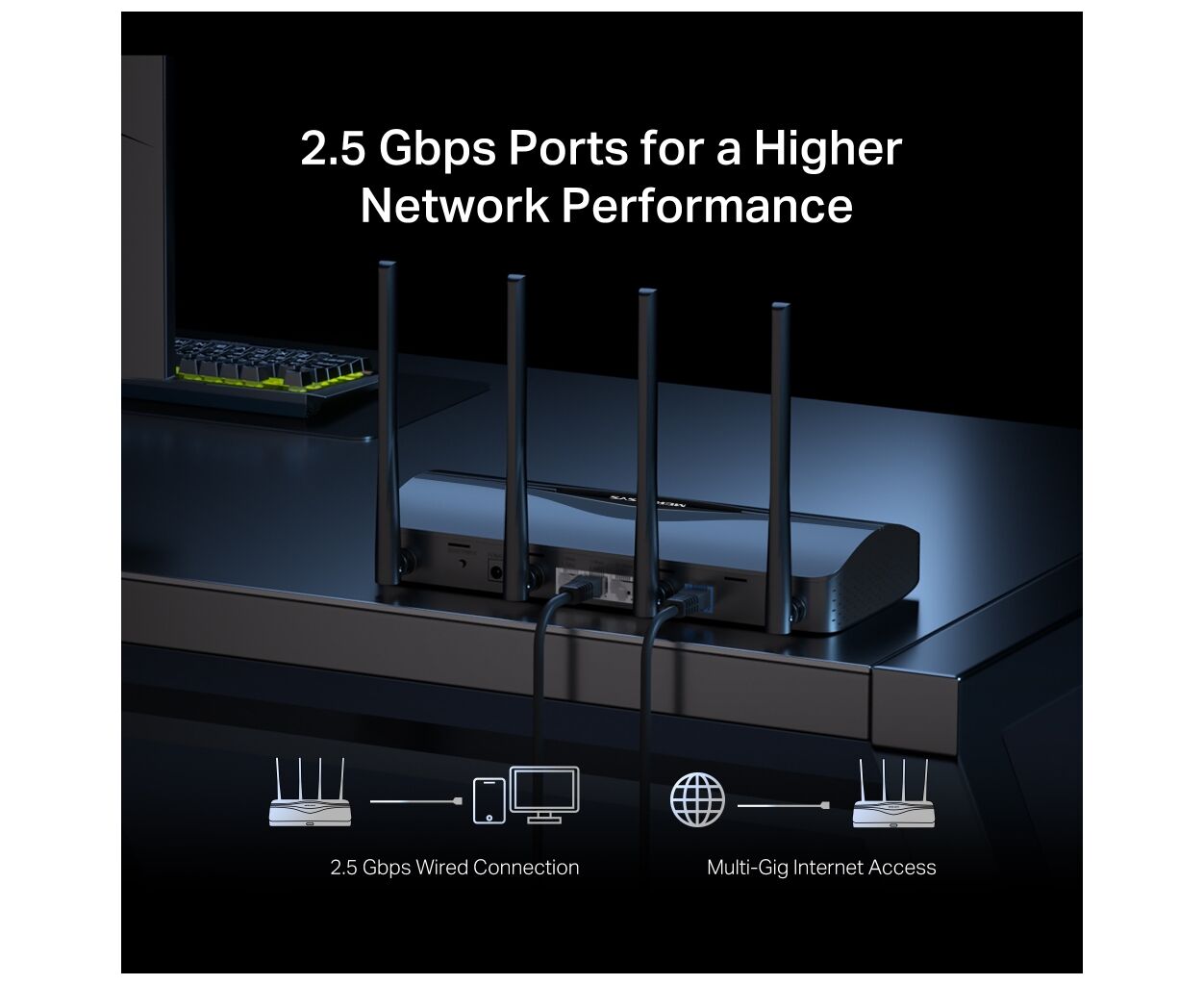 Оснащений чотирма незнімними антенами та портами зі швидкістю до 2.5 Гбіт/с, MR27BE відмінно підходить для підключення ПК, смарт-телевізорів та ігрових консолей, забезпечуючи стабільне та швидке дротове з'єднання. Використовуйте протоколи l2TP, IPv4, IPv6, PPPoE і PPTP для налаштування мережі на ваш смак.