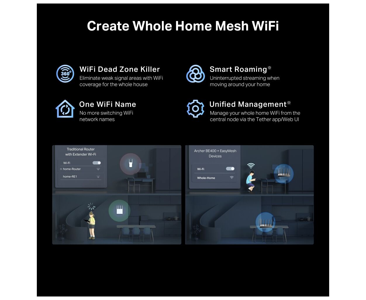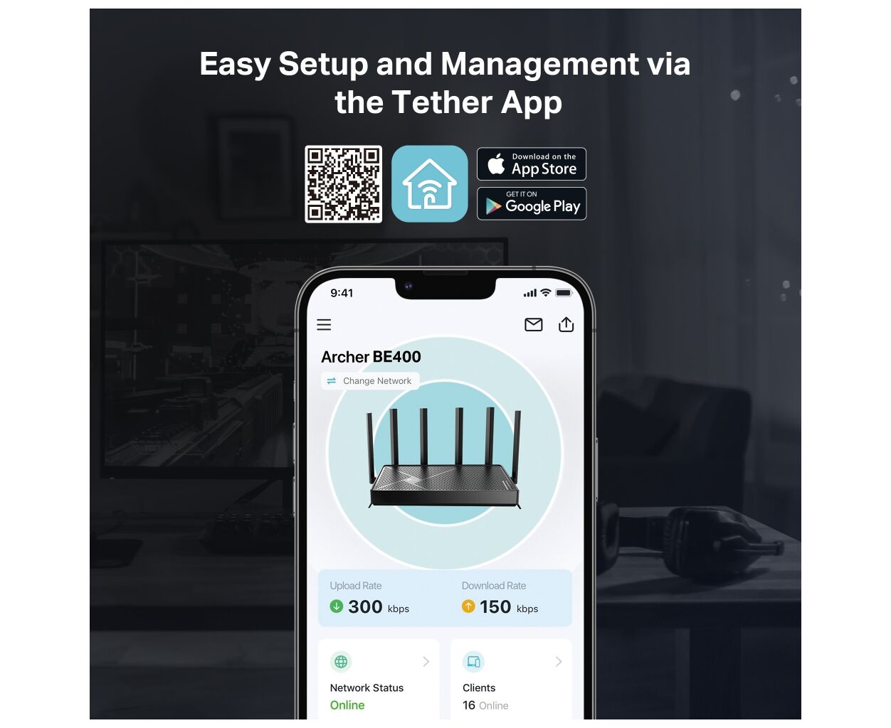 Цей маршрутизатор також підтримує можливості VPN для посиленої безпеки вашої мережі. Завдяки потужному додатку Tether, налаштування Archer BE400 відбувається буквально за кілька хвилин, забезпечуючи стабільне та надійне з'єднання у вашому домі без зайвих зусиль. Wi-Fi наступного покоління з TP-Link Archer BE400 – це ваш ідеальний вибір для створення сучасної домашньої мережі.