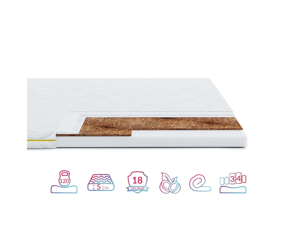 - Шар кокосової койри, додає виробу неперевершених властивостей. Кокосова койра - це природний матеріал, отриманий з волокон кокосових горіхів. Вона забезпечує відмінну вентиляцію та підтримку, що сприяє оптимальному комфорту під час сну. Завдяки своїй жорсткості, цей шар допомагає підтримувати правильне положення хребта, знижуючи ризик виникнення болю в спині. Крім того, кокосова койра має гіпоалергенні властивості, що робить матрац ідеальним вибором для людей з чутливою шкірою або алергіями.