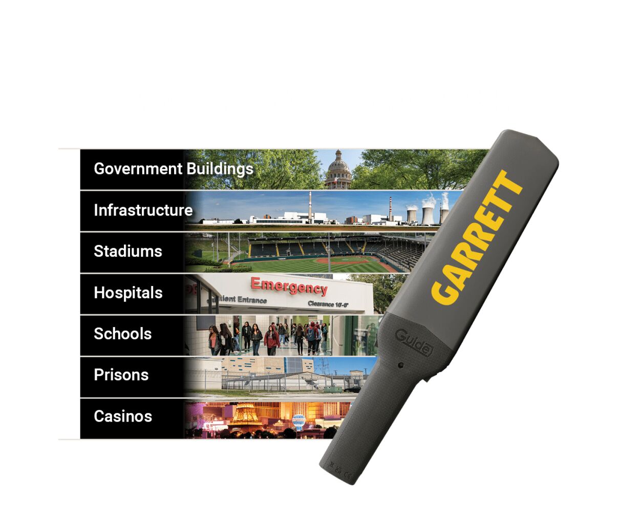 Металодетектор ручний Garrett Guide відповідає міжнародним стандартам безпеки та перевірки: NIJ – Національний Інститут Юстиції США. ECAC, DGAC, STAC, TSA – Авіаційна безпека.