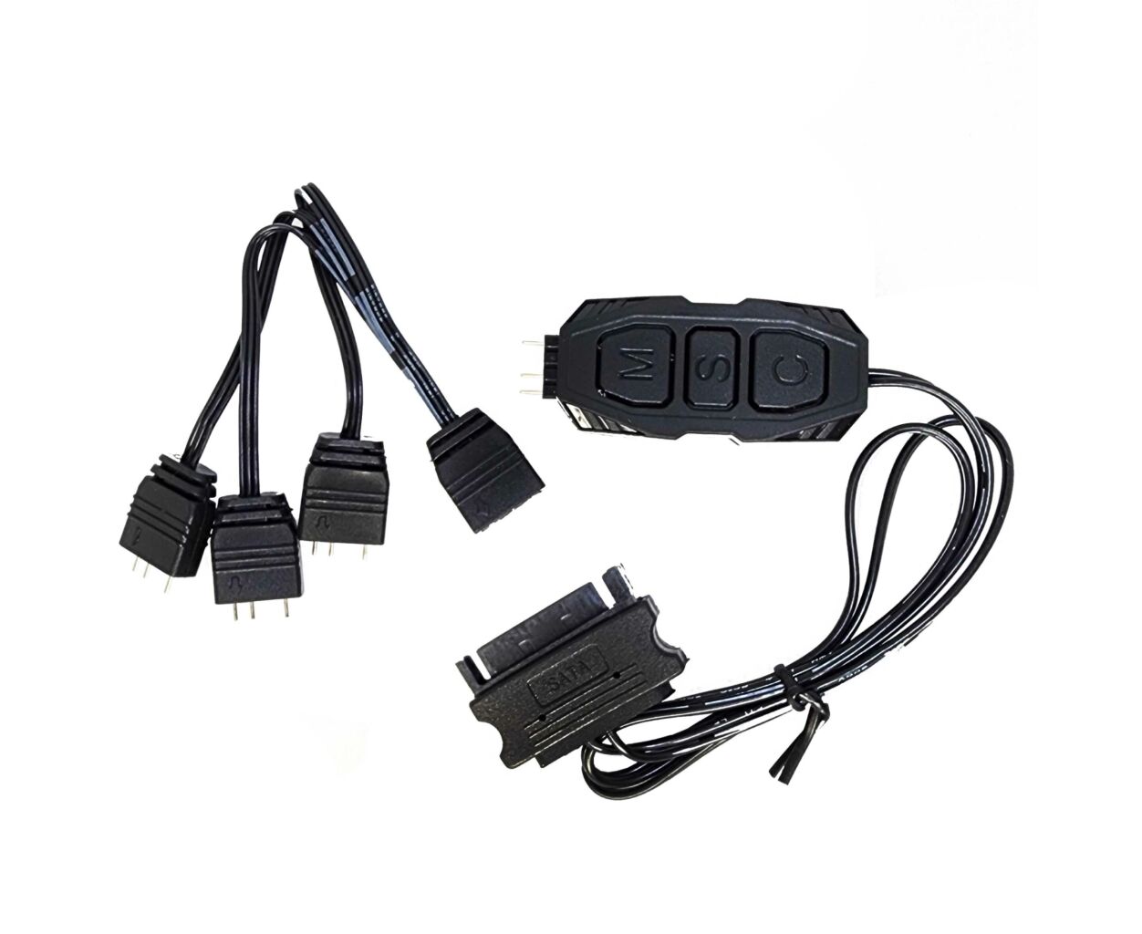 Довжина кабелю синхронізації становить 12 см, довжина кабелю на дротовому контролері становить 45 см. Сам дротовий контролер Zezzio ARGB Controller підключається до блоку живлення комп’ютера через роз’єм SATA.