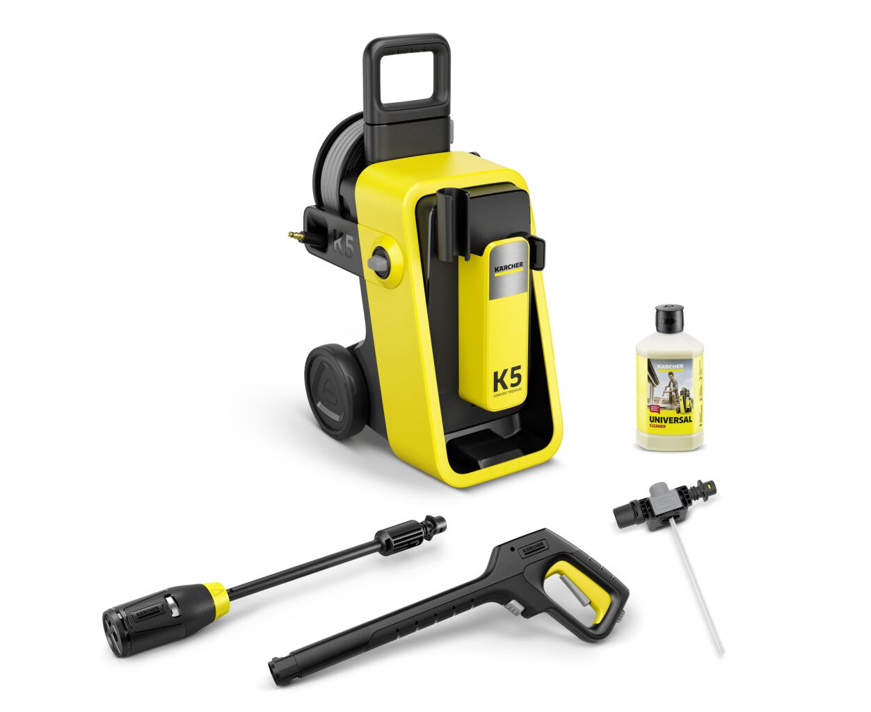 Мийка високого тиску K 5 Comfort Premium з продуктивністю по площі 40 м²/год, двигуном з водяним охолодженням, шлангом PremiumFlex і барабаном для шланга відмінно підійде для усунення забруднень середнього ступеня.