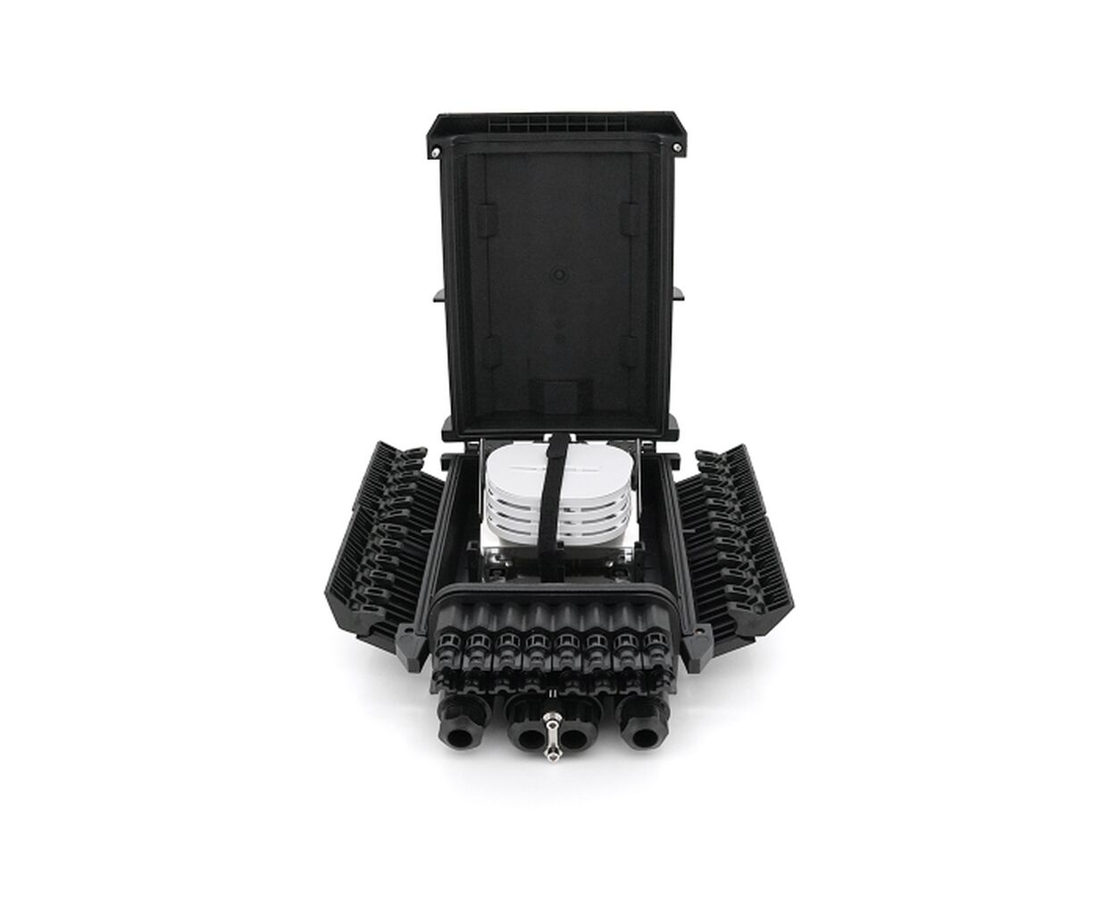 Опис Муфта оптична Merlion 4 вводи, до 4-х касет, до 96 зварок в два слої, матеріал ABS (ML-OP-F203)