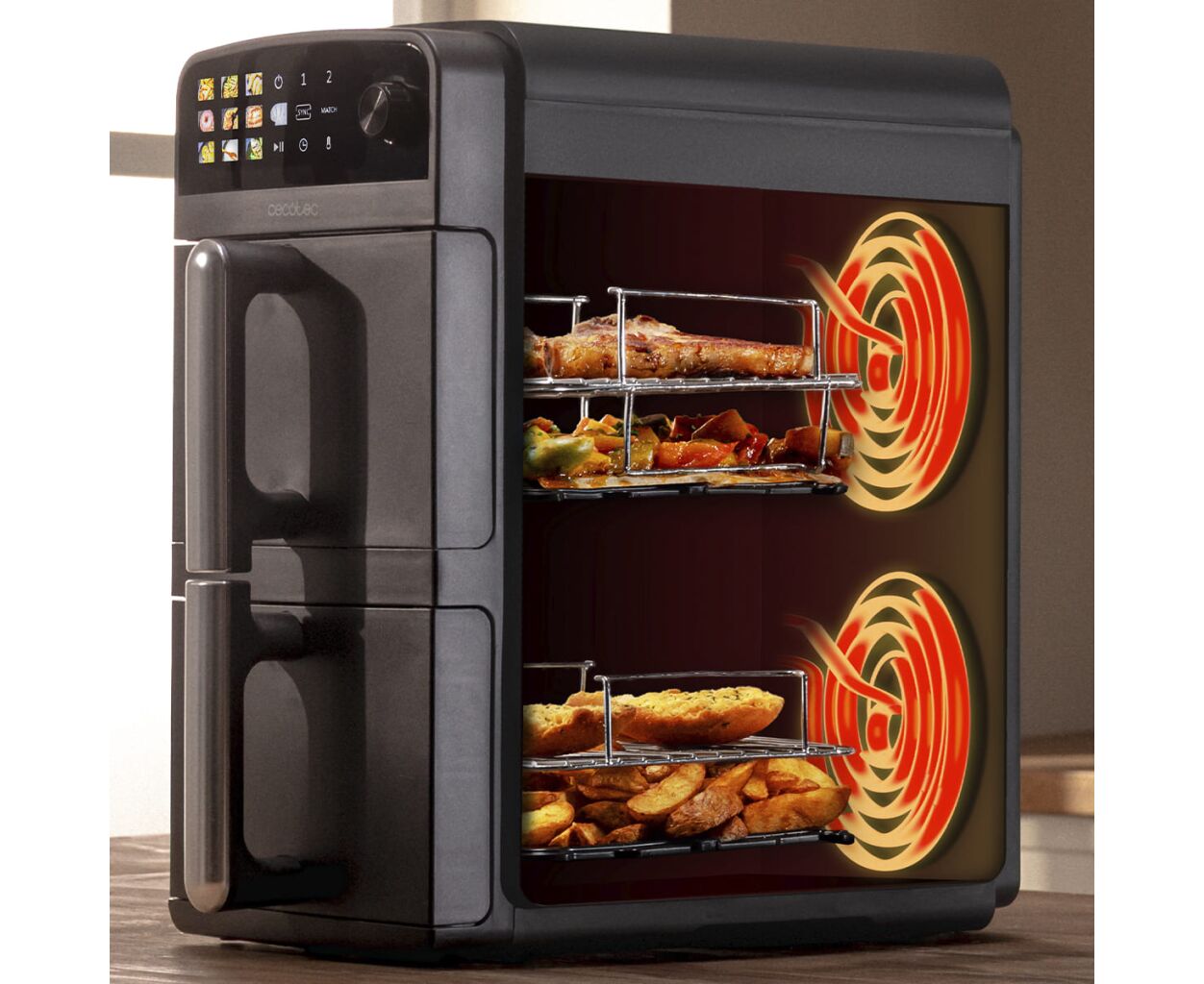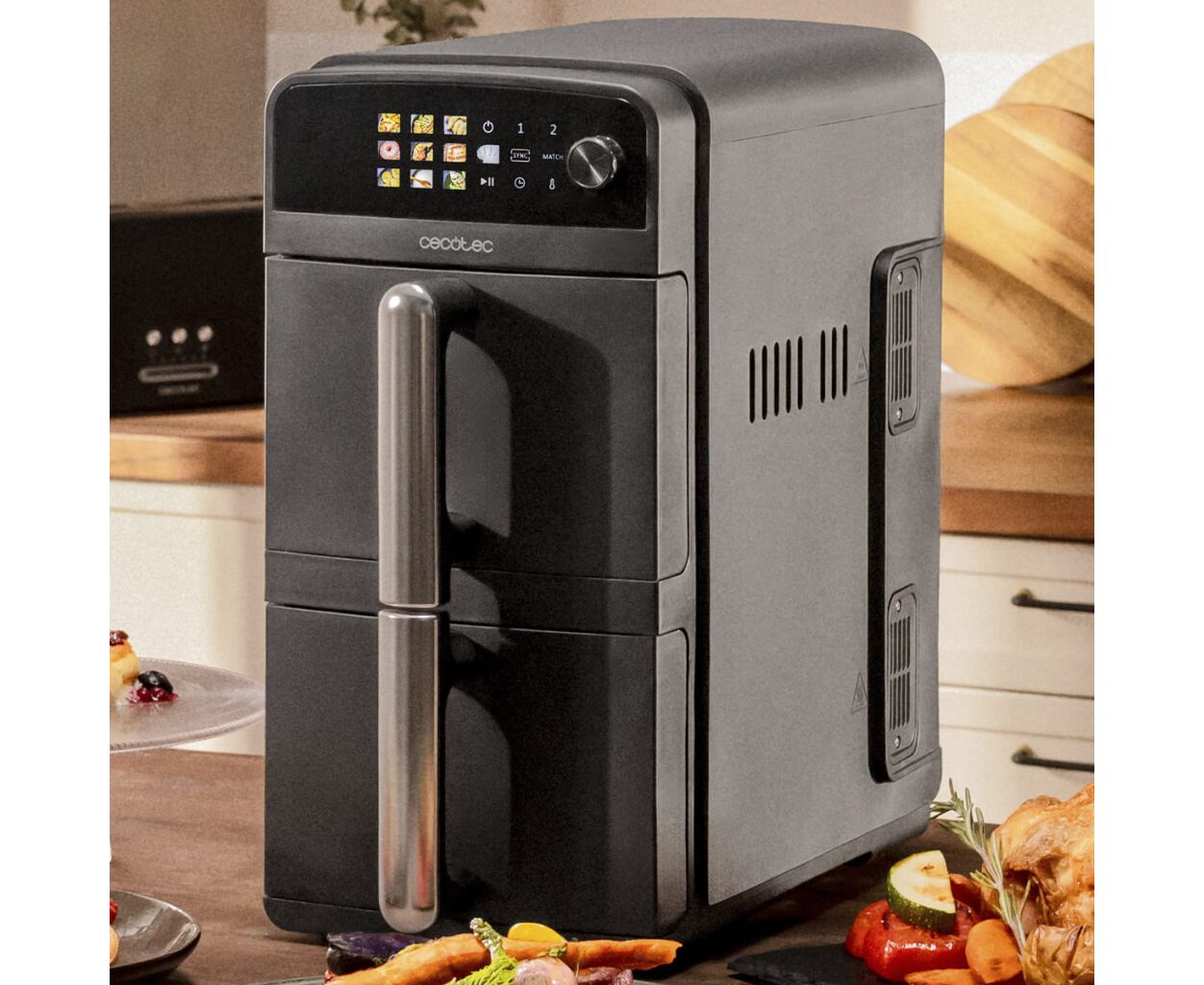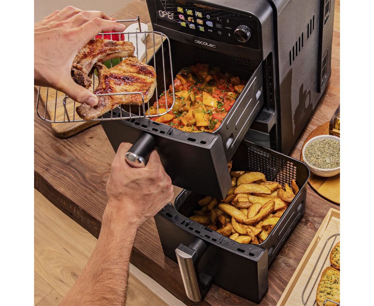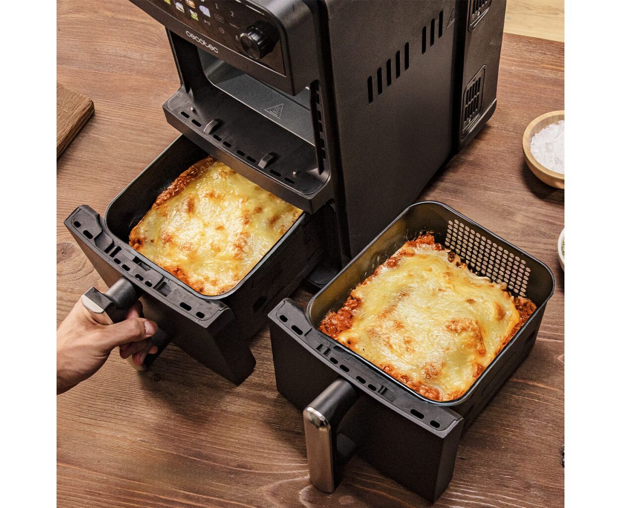 Два контейнери для приготування їжі об’ємом 5 літрів дозволяють готувати дві страви одночасно у різний спосіб, займаючи менше місця на стільниці завдяки вертикальній конструкції мультипечі Cecotec.