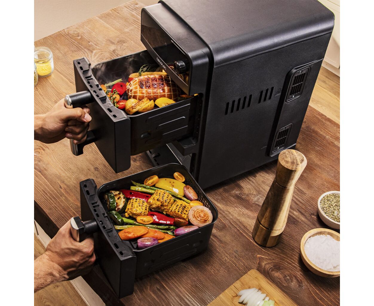 Функція синхронізації дозволяє готувати дві різні страви в кожному контейнері та запрограмувати їх на одночасне приготування. Забудьте про очікування і те, що їжа охолоне.