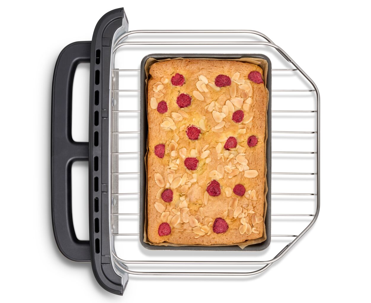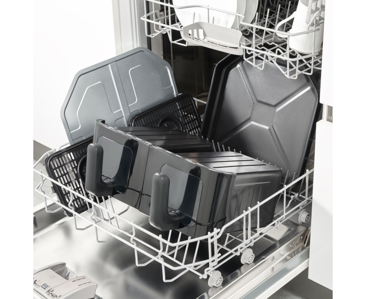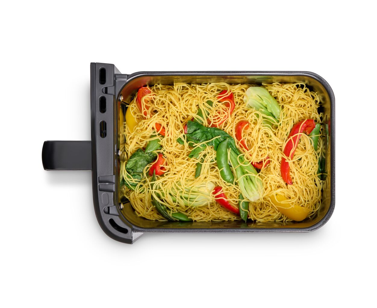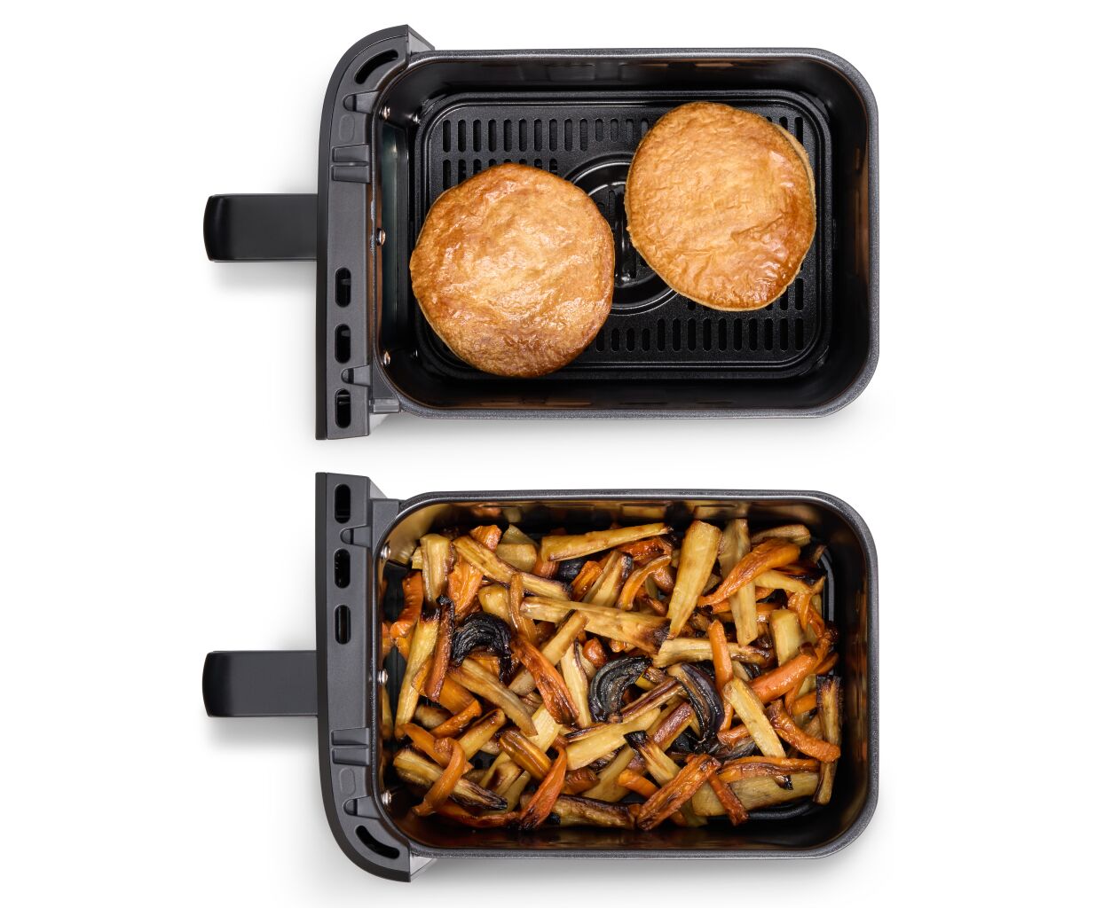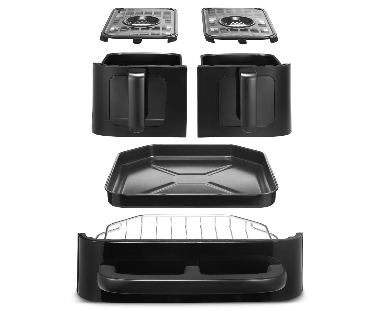 Основою конструкції є два кошики по 4,3 л та велика плоска шухляда-духовка на 5 л, забезпечуючи загальну місткість 13,6 л. Ви легко приготуєте курча, овочі або 30-сантиметрову піцу.
