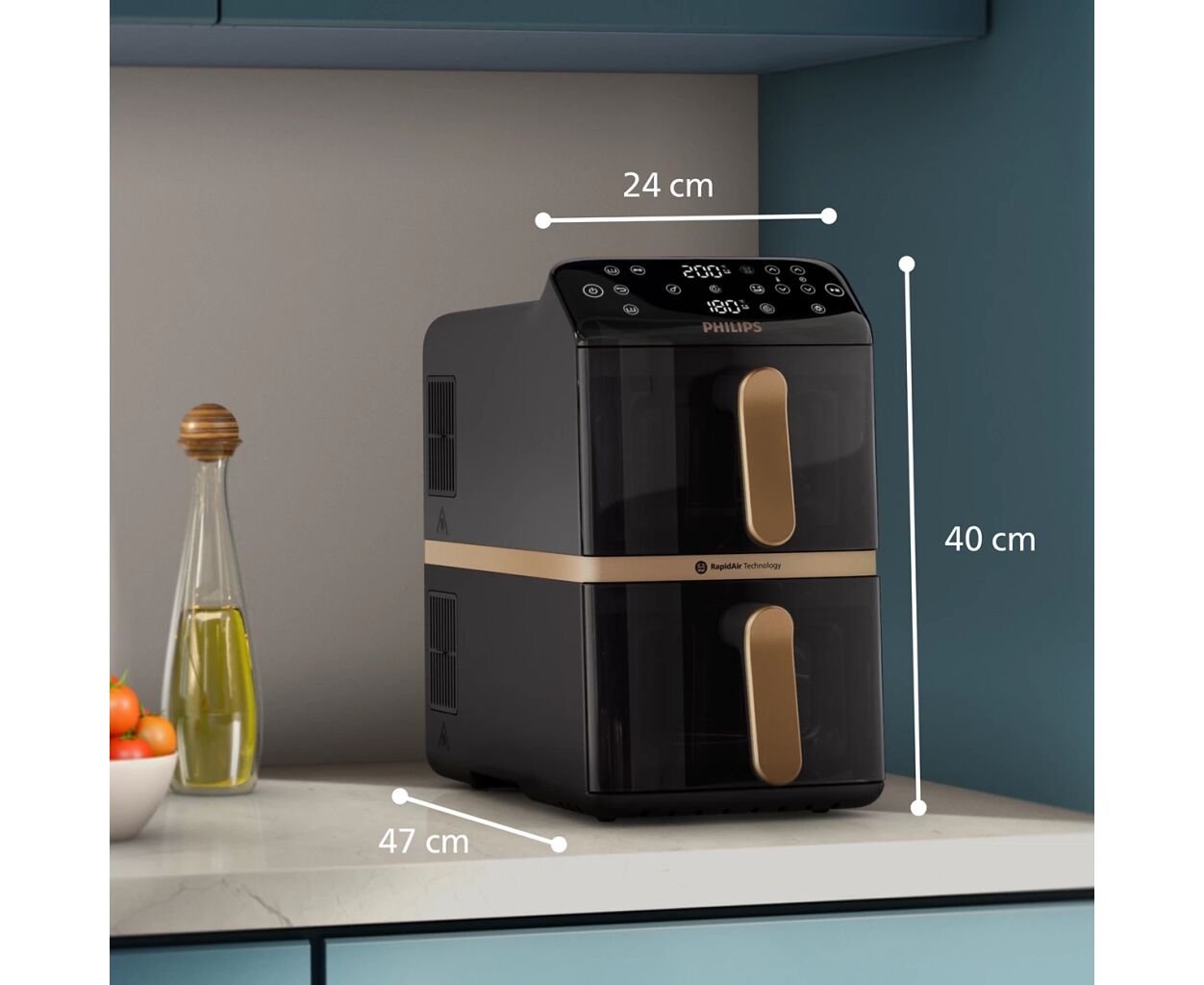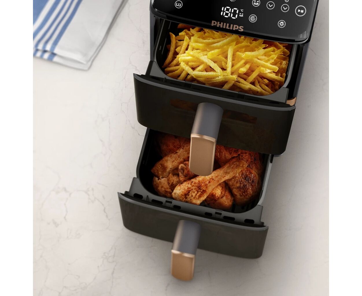 Philips Ovi Stacked Dual Basket має нове антипригарне покриття без PFAS, яке є міцним, стійким до подряпин і легким у догляді. Усі знімні частини можна мити в посудомийній машині. Прилад забезпечує до 40% швидше приготування та до 65% економії енергії у порівнянні зі звичайною духовкою.