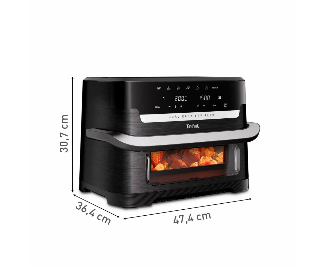 Відкрийте для себе мультипіч Tefal Dual Easy Fry Flex — ідеальне поєднання універсальності та місткості. Завдяки знімному роздільнику FlexCook ви можете легко перемикатися з двох незалежних зон приготування (5,5 л + 3,5 л) на одну велику GiantZone об’ємом 9 л. Це дозволяє готувати як щедрі порції для всієї родини, так і різні страви одночасно з індивідуальними налаштуваннями часу та температури.