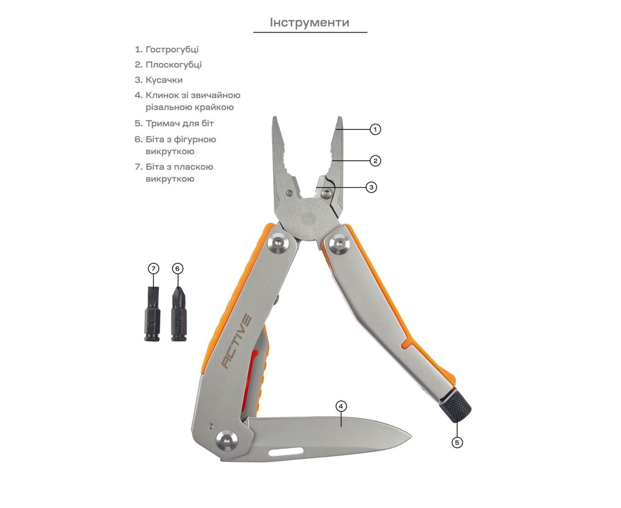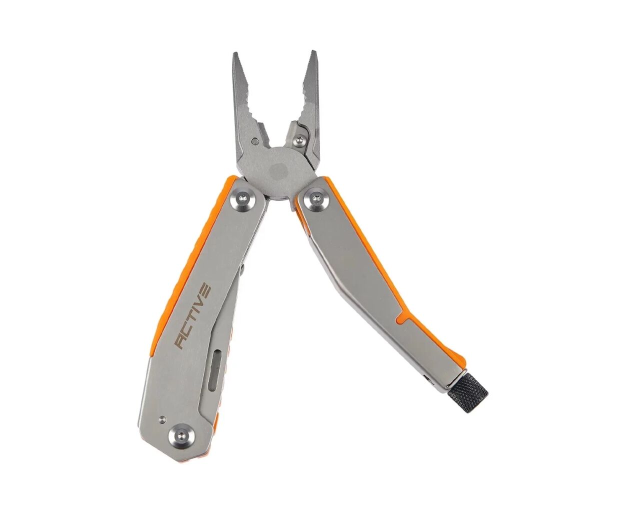 Active Basic – це багатофункціональний інструмент, що стане у нагоді, як у повсякденному житті, так і під час відпочинку на природі або кемпінгу. Мультитул виготовлений з нержавіючої сталі та має яскраві помаранчеві пластикові вставки, що виділяє його серед іншого спорядження та мінімізує вірогідність загубити. Active Basic має такі інструменти як: підпружинені плоскогубці з кусачками, ніж зі звичайною різальною крайкою, а також дві біти з фігурною та пласкою викрутками. Крім цього, на мультитулі встановлена кишенькова кліпса. Комплектується Active Basic нейлоновим чохлом.