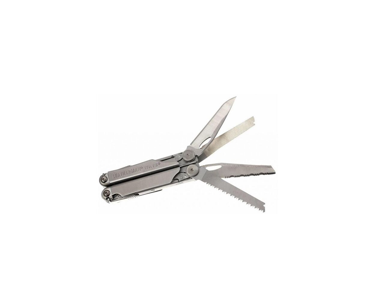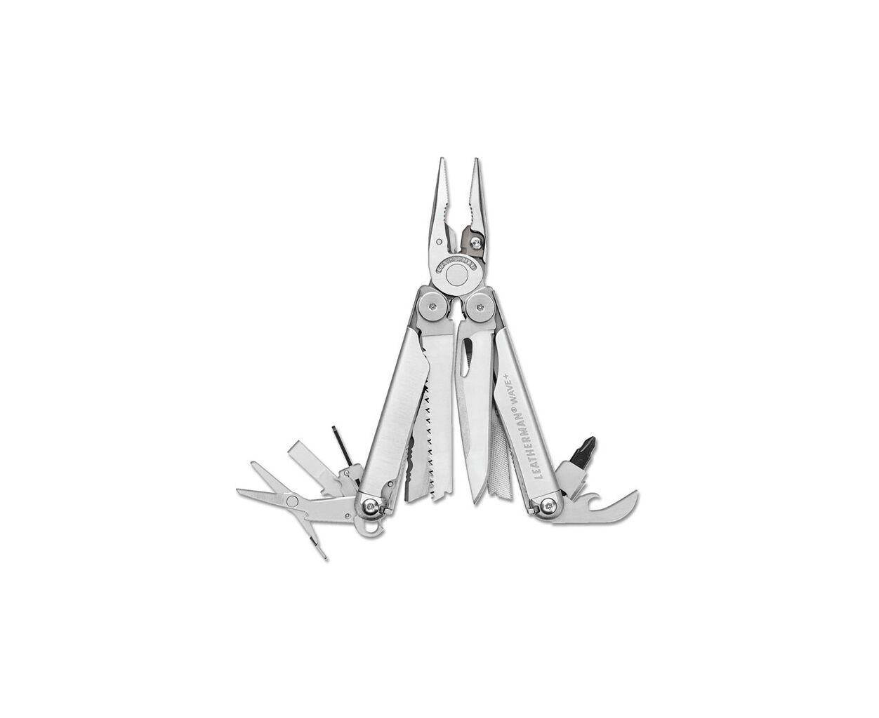Leatherman Wave включає в свою структуру 18 функціональних пристроїв, здатних вирішувати найширший спектр завдань. Він містить стандартний ніж з прямим лезом та серрейтор зі сталі 420HC, призначені для розрізання щільних матеріалів, таких як картон, мотузки, канати, пластик, тенти, ремені з нейлону та шкіри тощо. У нього також входять плоскогубці, гострогубці, тримач для великих і малих біт, змінні біти, стандартні знімні кусачки та кусачки для твердого дроту, середня викрутка, ножиці, пилка, напилок для дерева та металу, алмазний надфіль, відкривалки для пляшок та консервних лінійка довжиною 19 см та прилад для очищення проводів.