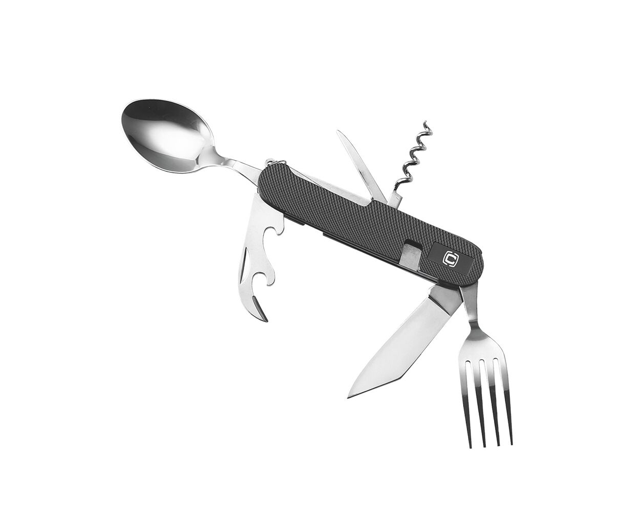Завдяки ергономічній анодованій алюмінієвій рукоятці, мультитул не тільки зручно лежить в руці, але й витримує суворі умови використання. В комплекті ви знайдете вісьм вкрай корисних інструментів: консервний ніж, ложку, виделку, штопор, льодокол, відкривач для пляшок, крюк для підвішування та ніж. Легка вага та компактні розміри (довжина всього 10.5 см) роблять цей мультитул ідеальним для перенесення.