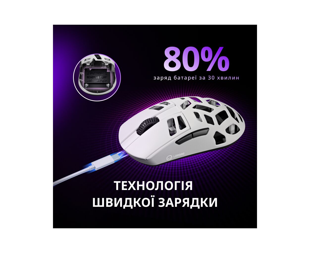 Інноваційна технологія швидкої зарядки дозволяє досягти 80% заряду всього за 30 хвилин, надаючи до 500 годин автономної роботи, що особливо важливо для геймерів, які проводять багато часу за розвагами і не хочуть відволікатися на підзарядку у вирішальні моменти.
