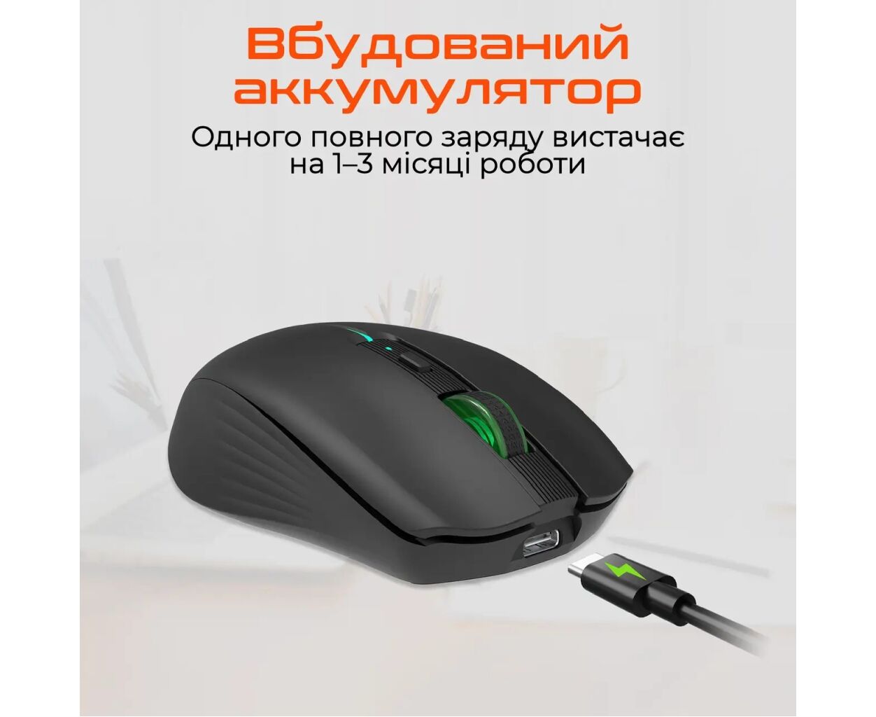 Мишка оснащена вбудованим акумулятором, який забезпечує до 1-3 місяців роботи без необхідності постійної заміни батарейок. Заряджайте пристрій зручно через USB Type-C і насолоджуйтеся оптимізованою роботою завдяки енергоефективній конструкції.