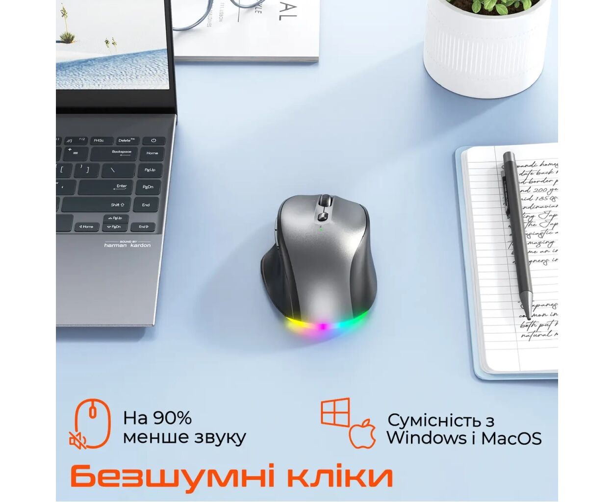 Живлення від акумулятора ємністю 650 мАг з економією заряду та функцією режиму сну гарантує тривалу автономність. Ергономічний корпус, створений з приємного на дотик матеріалу, забезпечує комфортний хват і природне відчуття в руках. Додаткова LED-підсвітка надає стильності вашому робочому простору.