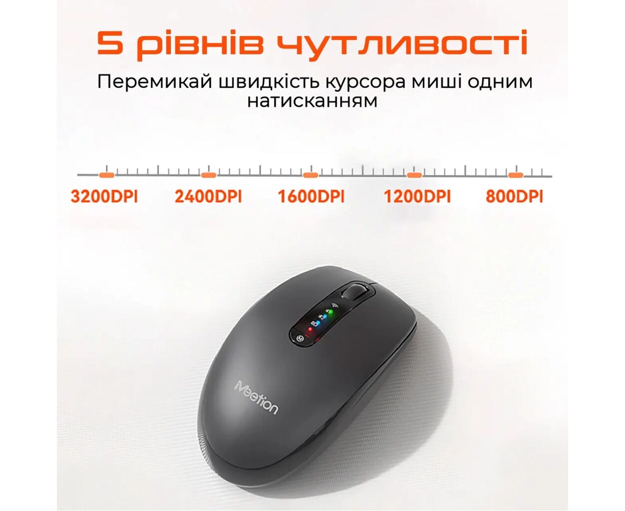 Завдяки оптичному датчику з роздільною здатністю до 3200 dpi, ця миша забезпечує точність та швидкість роботи, дозволяючи обирати серед п’яти рівнів чутливості – 800, 1200, 1600, 2400 та 3200 dpi.