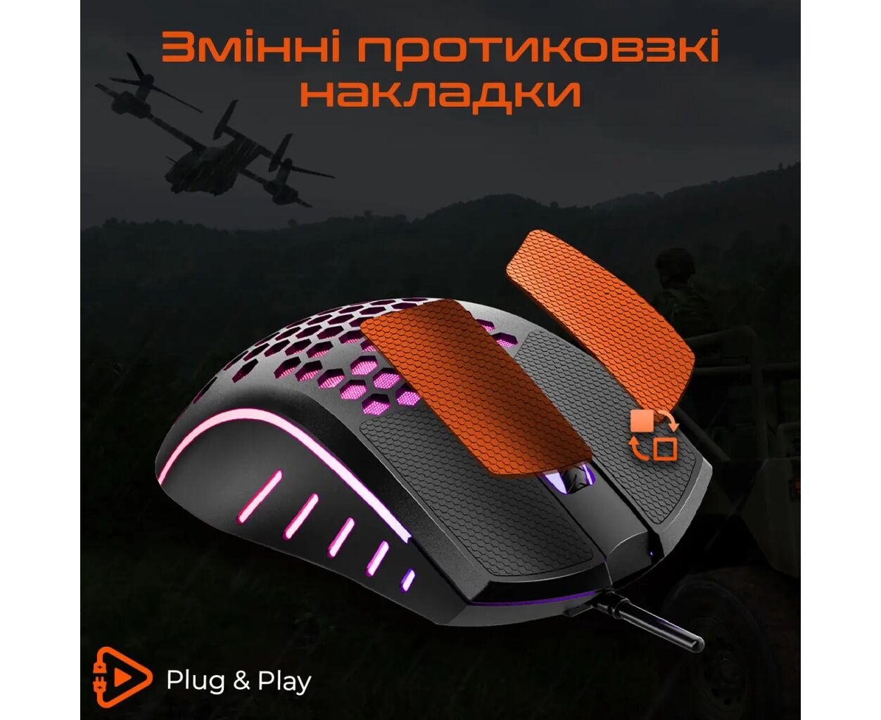 RGB-підсвітка не лише додає привабливості, але й вказує на обраний рівень DPI, що робить управління налаштуваннями ще зручнішим. Легка конструкція, доповнена Soft-Touch покриттям, забезпечує комфортний хват та протиковзке зчеплення в будь-яких умовах.