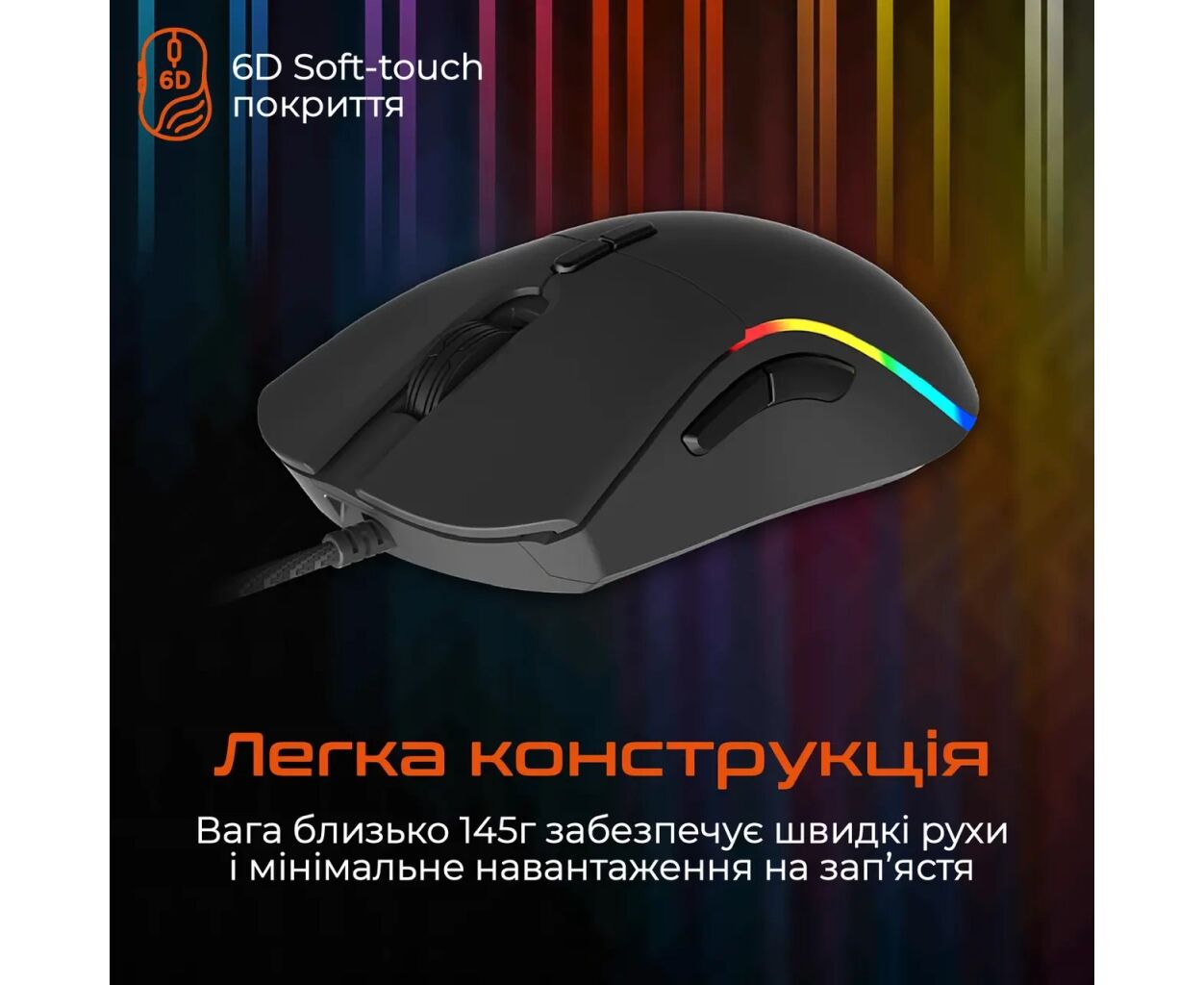 Для забезпечення комфорту під час тривалих ігрових сесій мишка має ергономічну форму та легку конструкцію вагою лише 145 г, що забезпечує швидкі рухи з мінімальним навантаженням на зап’ястя. Ви також оціните спеціальне 6D Soft-touch покриття, яке не тільки приємно на дотик, але і дає надійний хват.