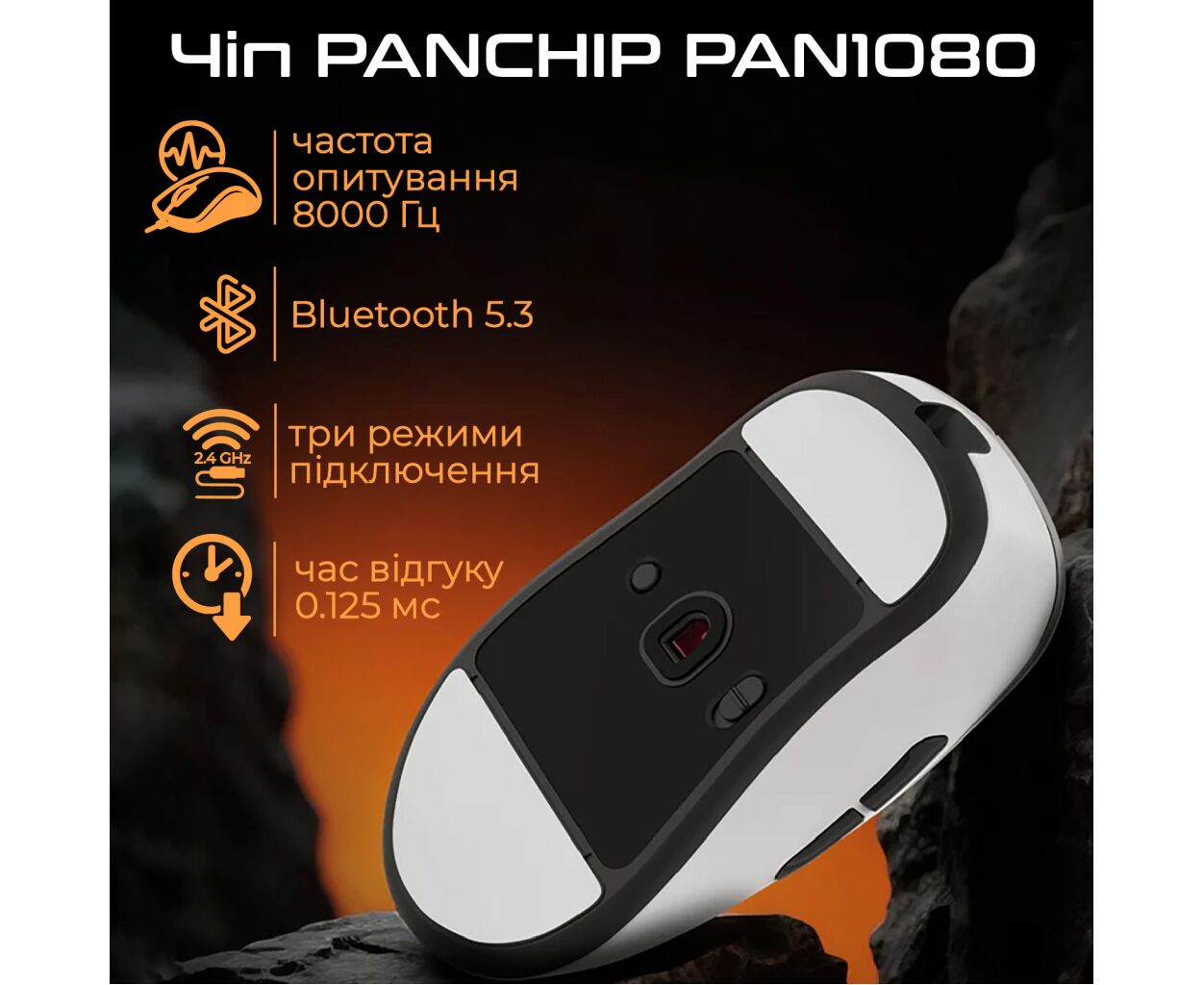 Чіп PANCHIP PAN1080: Забезпечує стабільну роботу мишки як в дротовому, так і в Bluetooth 5.3 та 2.4 ГГц бездротових режимах з частотою опитування до 8 кГц і миттєвою реєстрацією кліка з затримкою всього в ~0.125 мс.