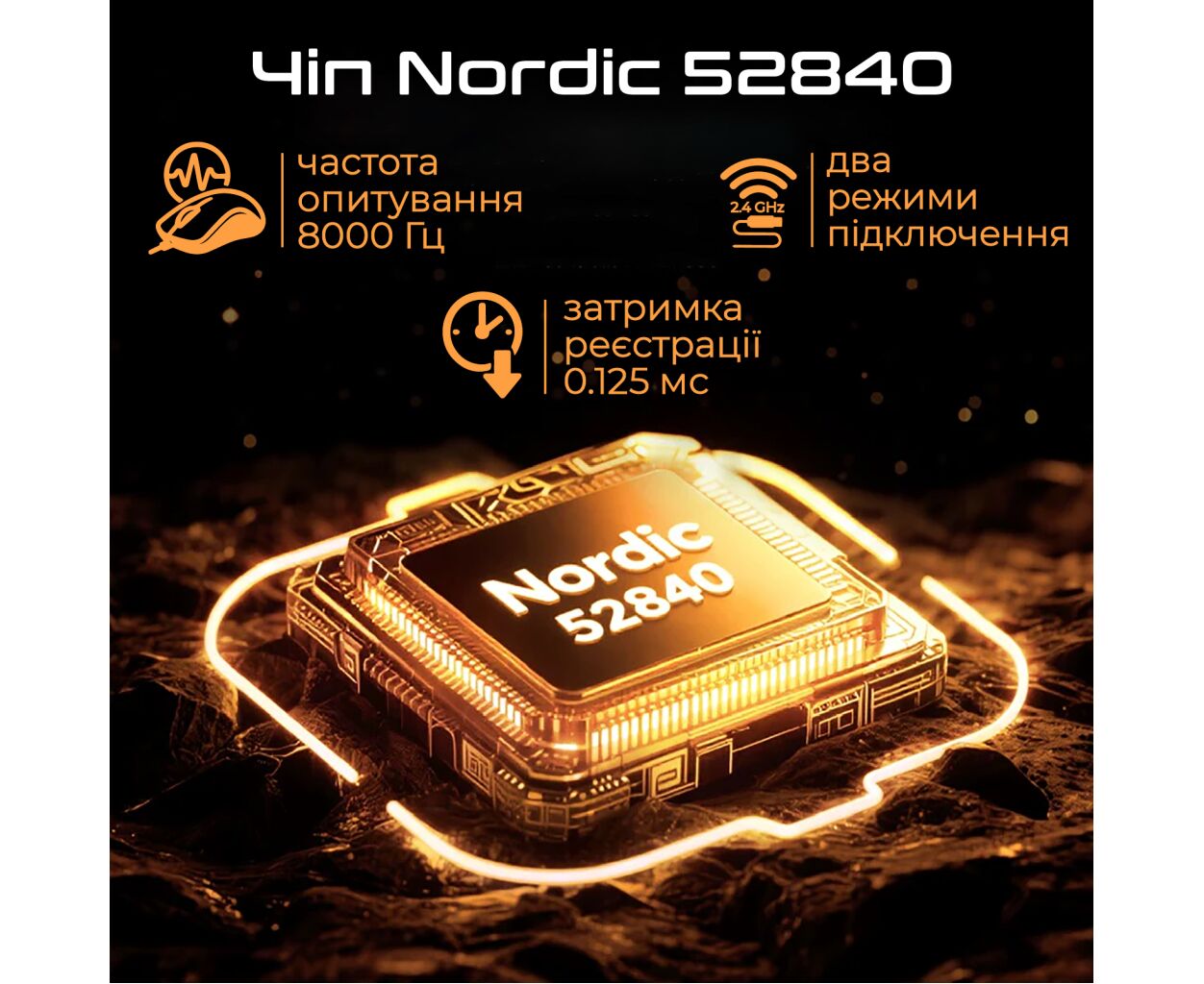 Чіп Nordic 52840: Забезпечує стабільну роботу мишки як в дротовому, так і в 2.4 ГГц бездротовому режимі з частотою опитування до 8 кГц і миттєвою реєстрацією кліка з затримкою всього в ~0.125 мс.