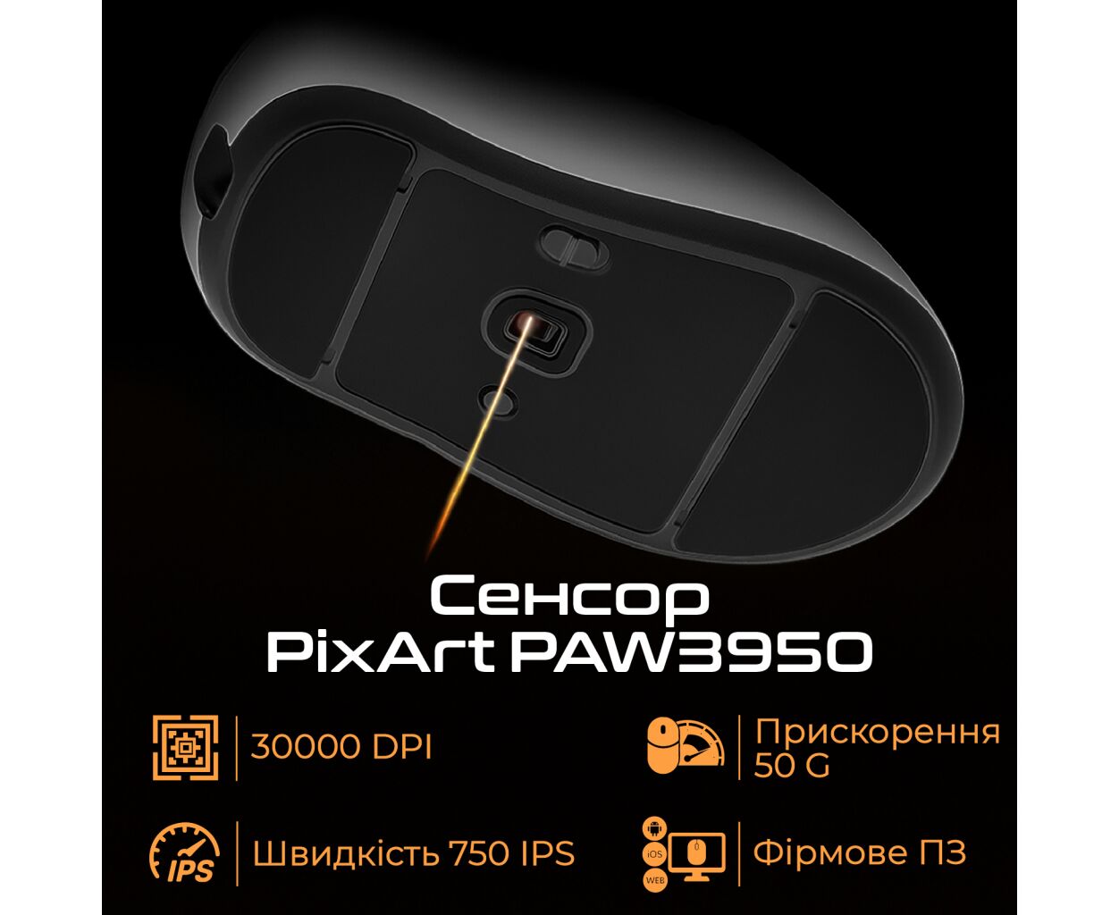 Сенсор PixArt PAW3950: ER21PRO оснащена флагманським оптичним сенсором PixArt PAW3950, що підтримує до 30 000 DPI, швидкість 750 IPS та прискорення до 50 g.