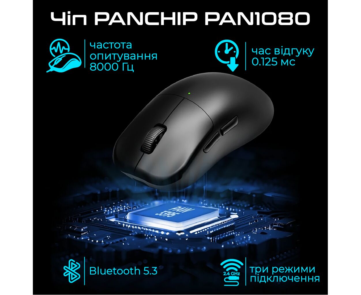 Чіп PANCHIP PAN1080: Забезпечує стабільну роботу мишки як в дротовому, так і в Bluetooth 5.3 та 2.4 ГГц бездротових режимах з частотою опитування до 8 кГц і миттєвою реєстрацією кліка з затримкою всього в ~0.125 мс.