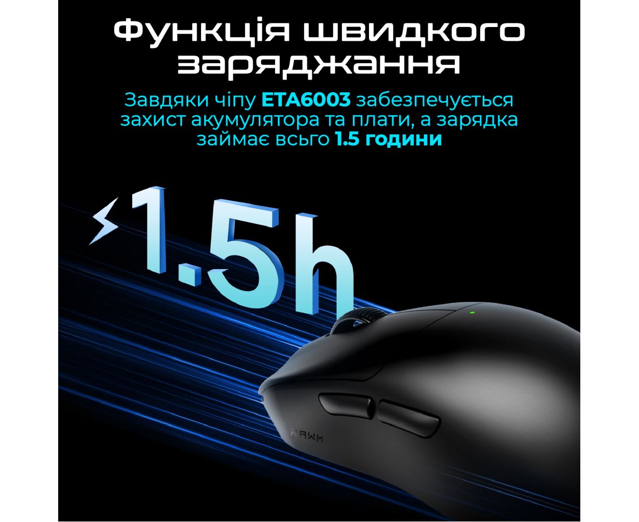 Функція швидкого заряджання: При підключенні кабелю, миша повністю заряджається всього за 1.5 години. Завдяки чіпу ETA6003 забезпечується захист акумулятора та плати, що дозволяє грати без перерв.