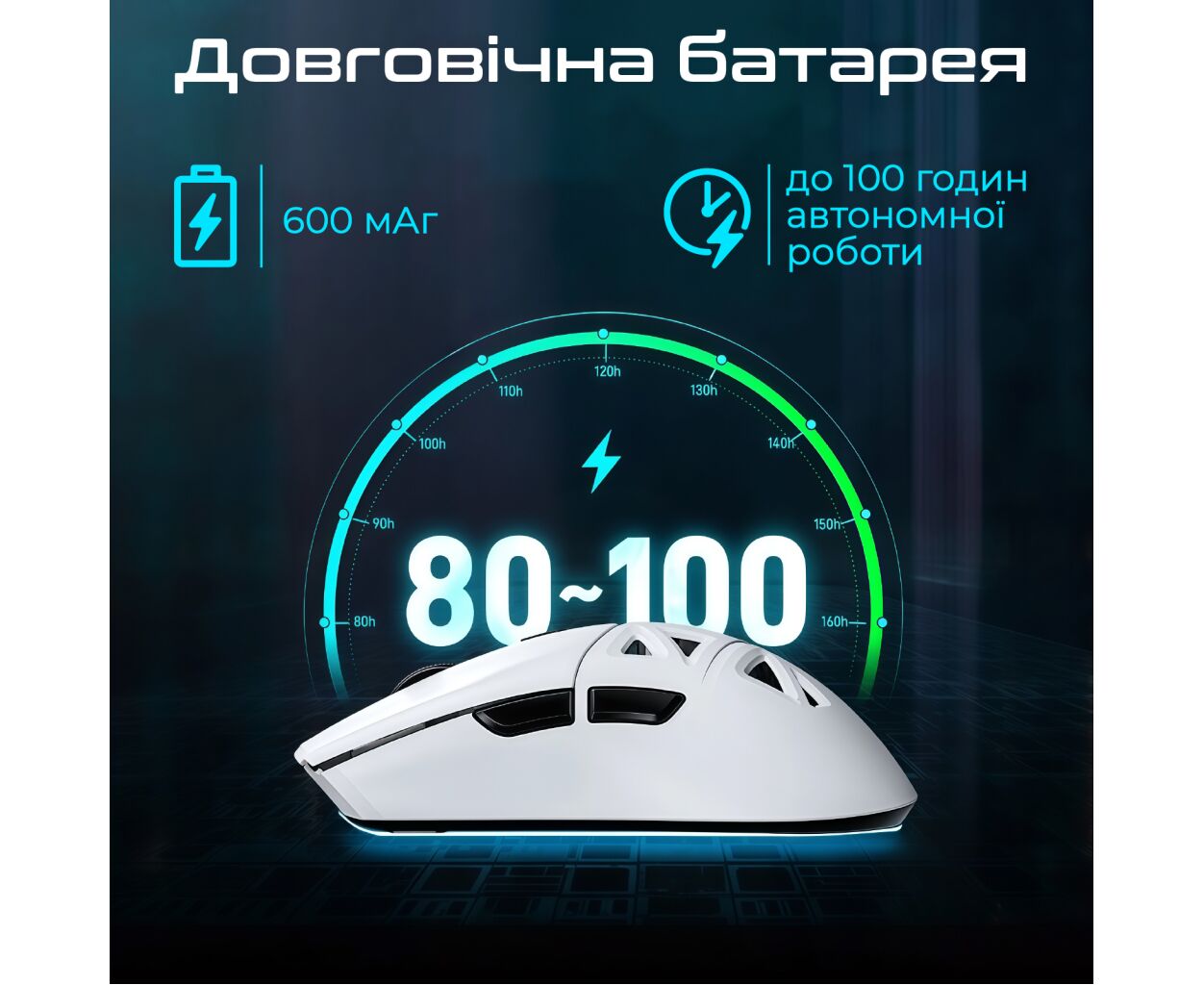 Довговічна батарея 600 мАг: Близько 100 годин автономної роботи із підтримкою дротового та бездротового режимів. Сама миша заряджається близько 3 годин.