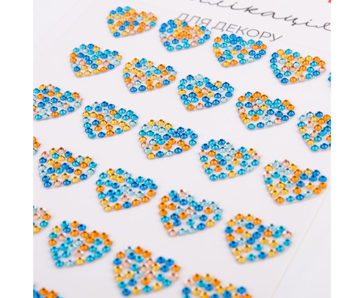 Серця синьо-жовті зі страз самоклеючих 9х15 см