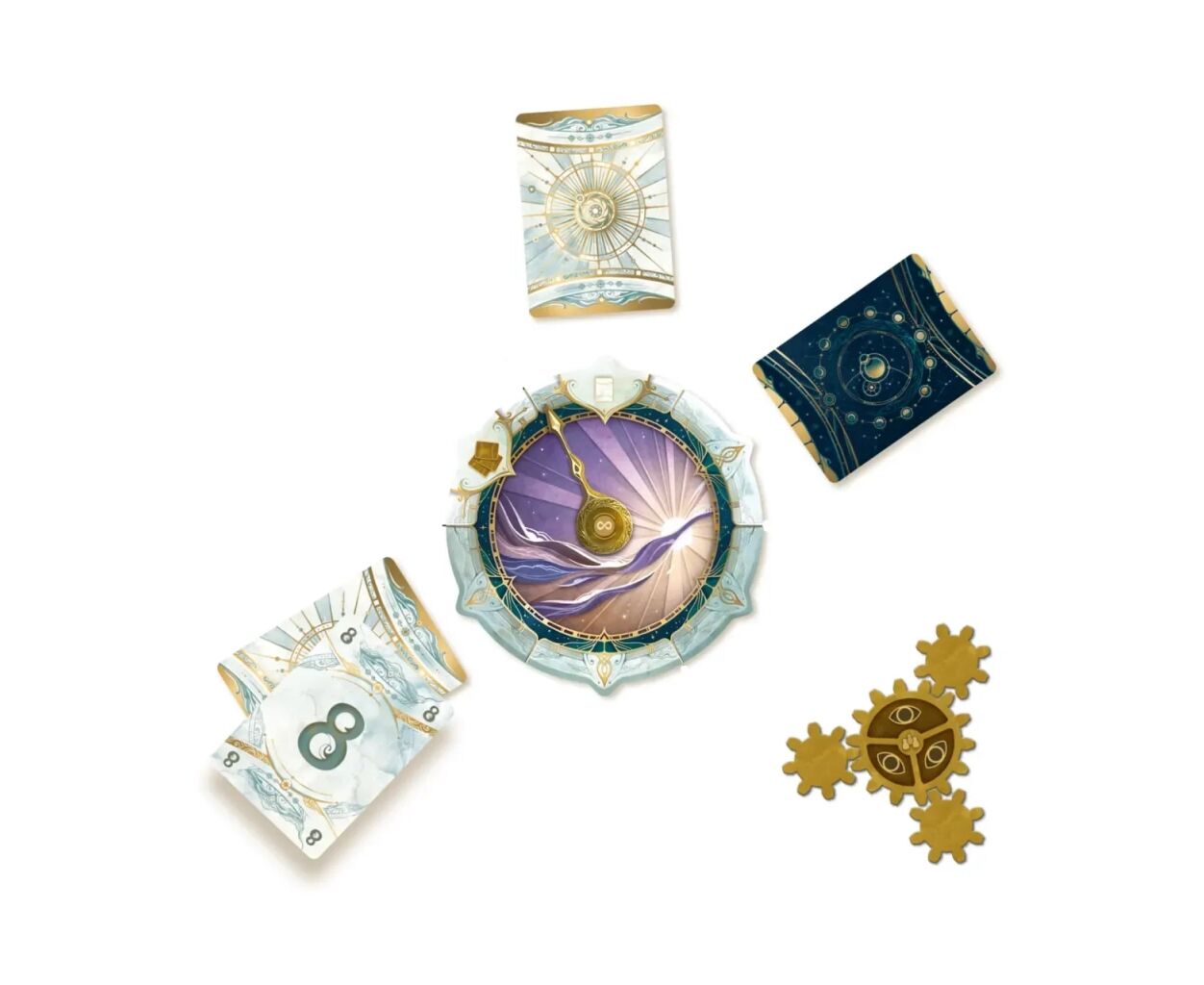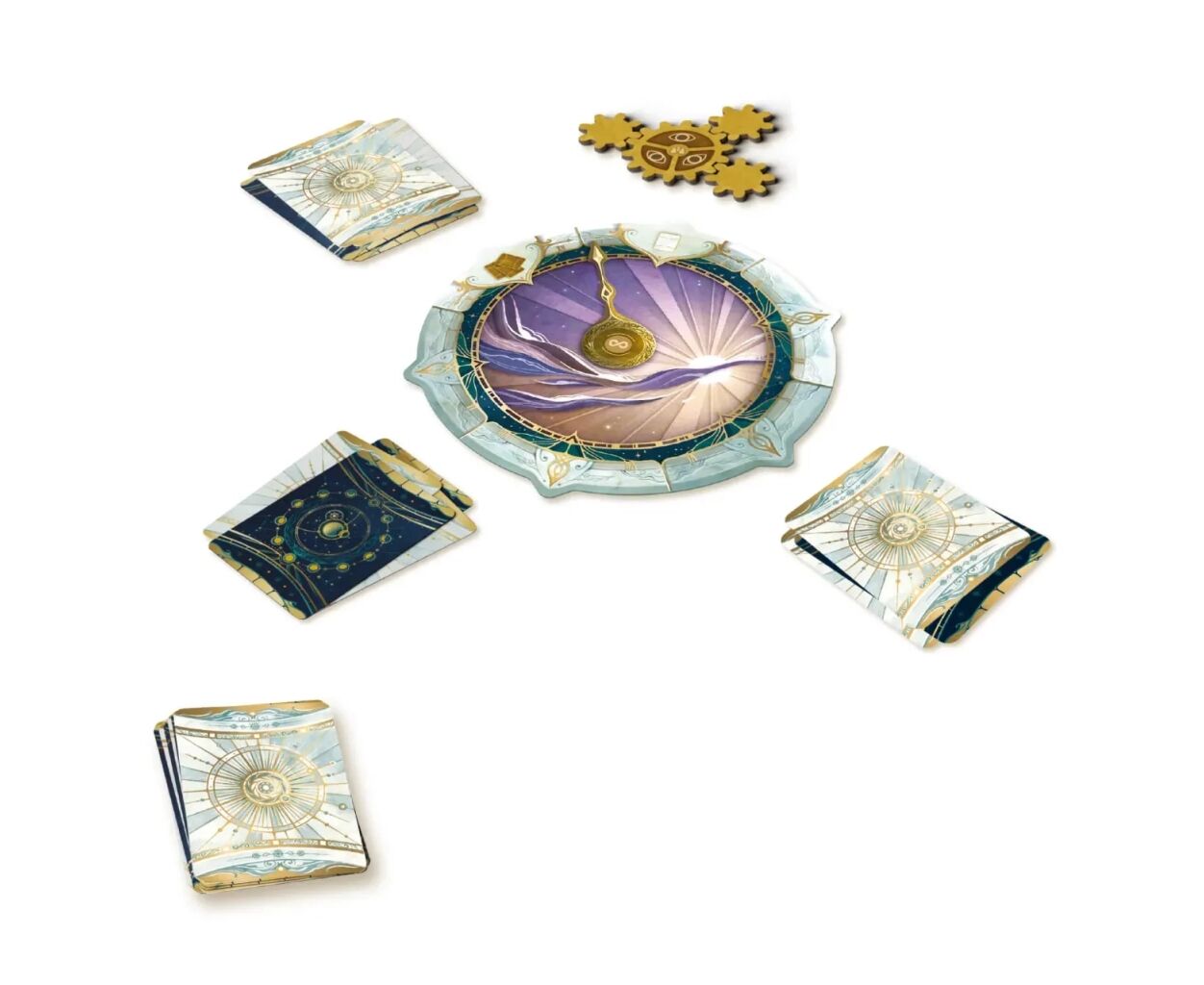 У комплектації гри 12 карт сонця та 12 карт місяця, які потрібно стратегічно викладати навколо чарівного годинника. Кожен із 10 конвертів розділів відкриє нові виклики, в яких ваша команда зіткнеться з унікальними завданнями, розділеними на три ключові фази: обговорення, розміщення та відкриття. Особливі жетони нагадування та жетони бонусів допоможуть підказати правильну стратегію. Атмосферне оформлення та чарівний дизайн компонентів створюють затишний простір для сімейного дозвілля.