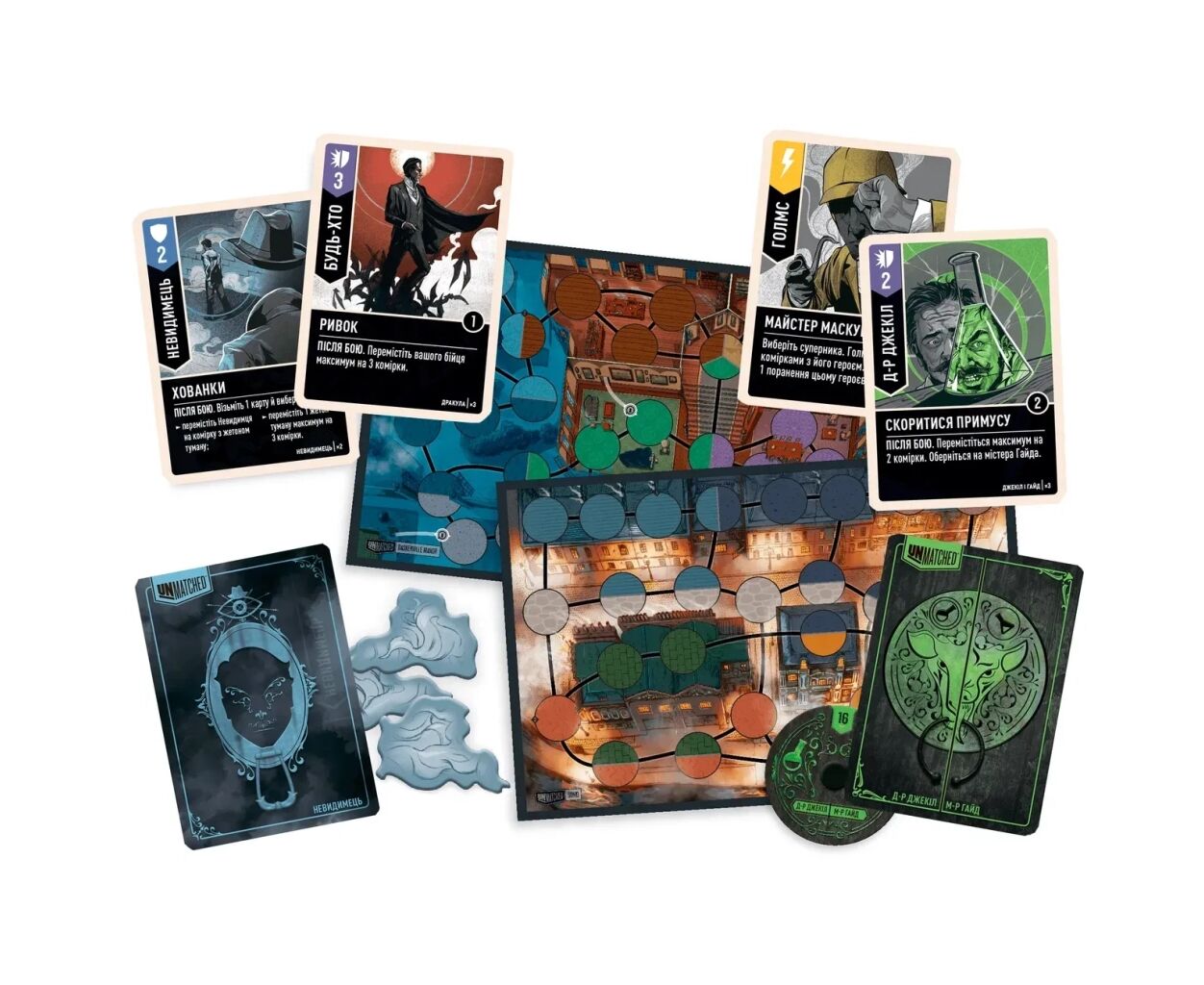 Одна з унікальних особливостей гри – спеціальні жетони смогу, які використовує Невидимець, щоб створювати несподівані загрози для суперників. Це додає гри динамічності, дозволяючи персонажам швидше переміщатися полем бою. Ви зможете випробувати різноманітні стратегії та виверти, щоб обнулити очки життя противника і здобути перемогу. Настільна гра Geekach Games Unmatched: Місто туманів – це не тільки битва, але й справжній театральний перформанс стратегій, що урізноманітнить кожний ваш ігровий вечір."