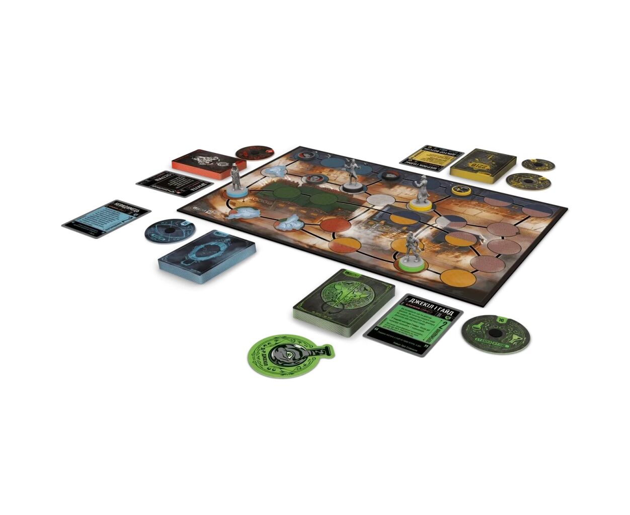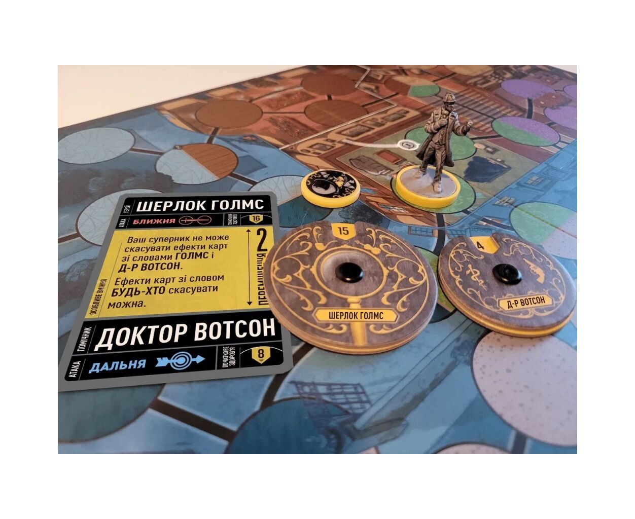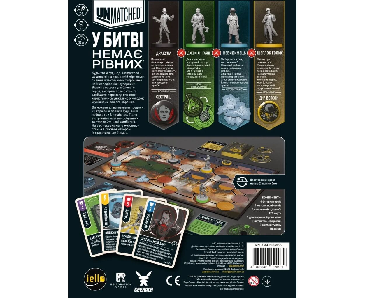 Гра розгортається в атмосферному Лондоні, де вулиці вкриті бруківкою і оповиті туманом. Чотири визнані герої – Шерлок Голмс, Дракула, Людина-невидимець, Джекіл і Гайд – готові випробувати свою силу та інтелект у битвах на двосторонньому полі бою. Комплект містить 4 фігурки героїв, а також 120 карток дій, що дозволяють використовувати безліч тактик і стратегій.