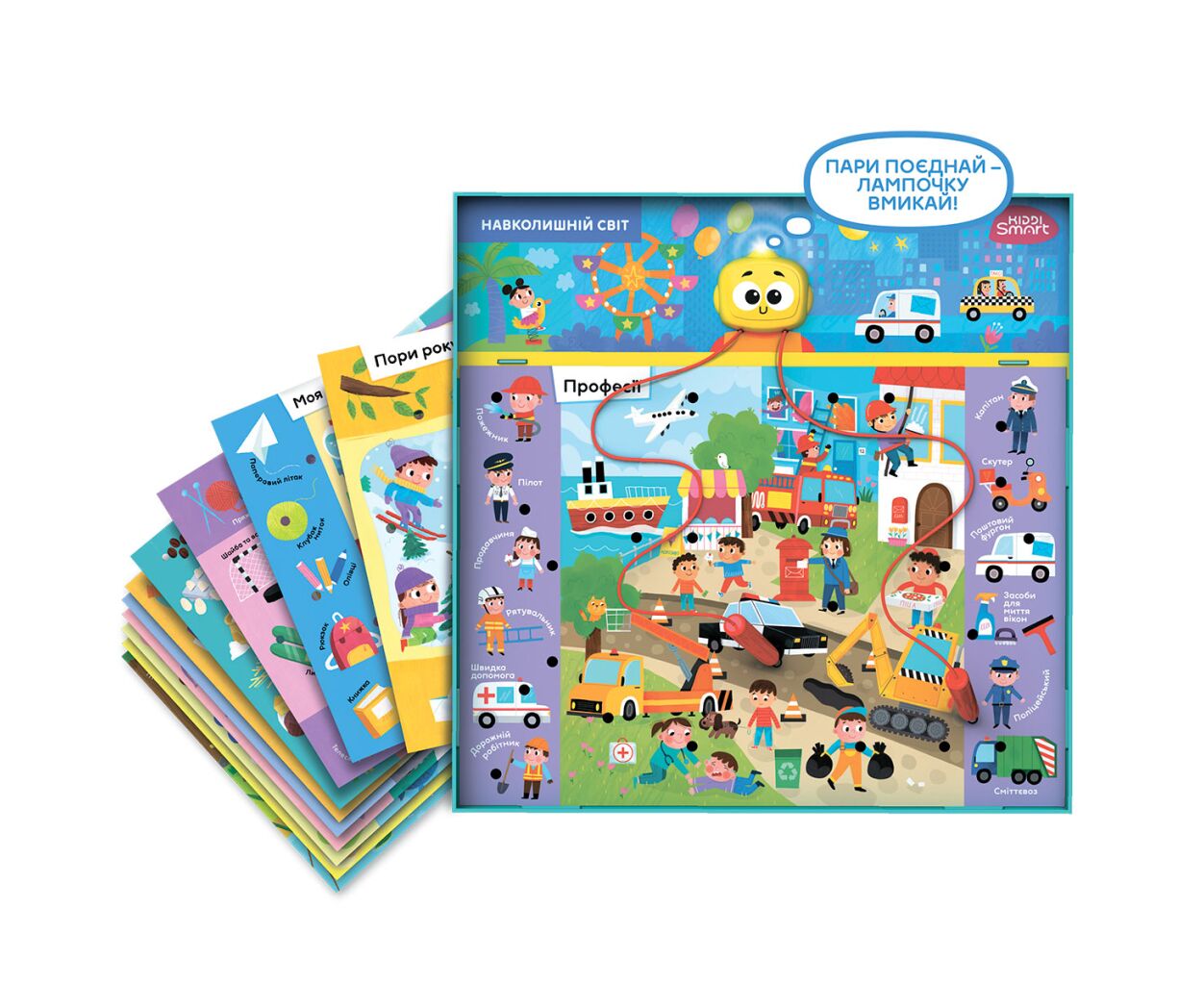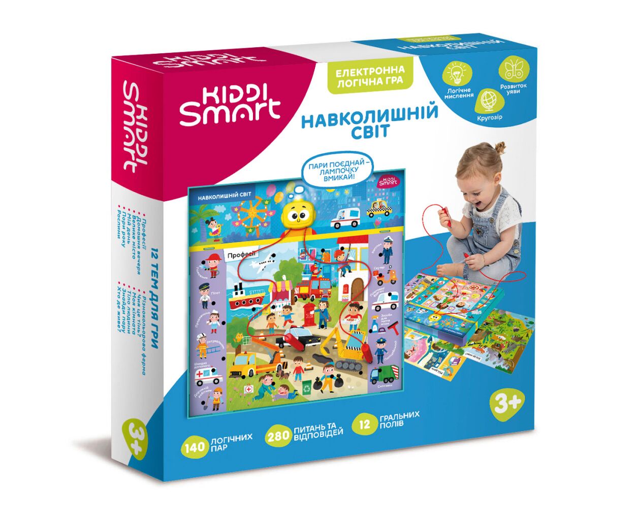 До комплекту включені електронна основа та 12 ігрових полів, що робить гру зручною та різнобічною. Забезпечте дитині не лише цікаву гру, а й корисні навички разом з Kiddi Smart Вікторина Навколишній світ!