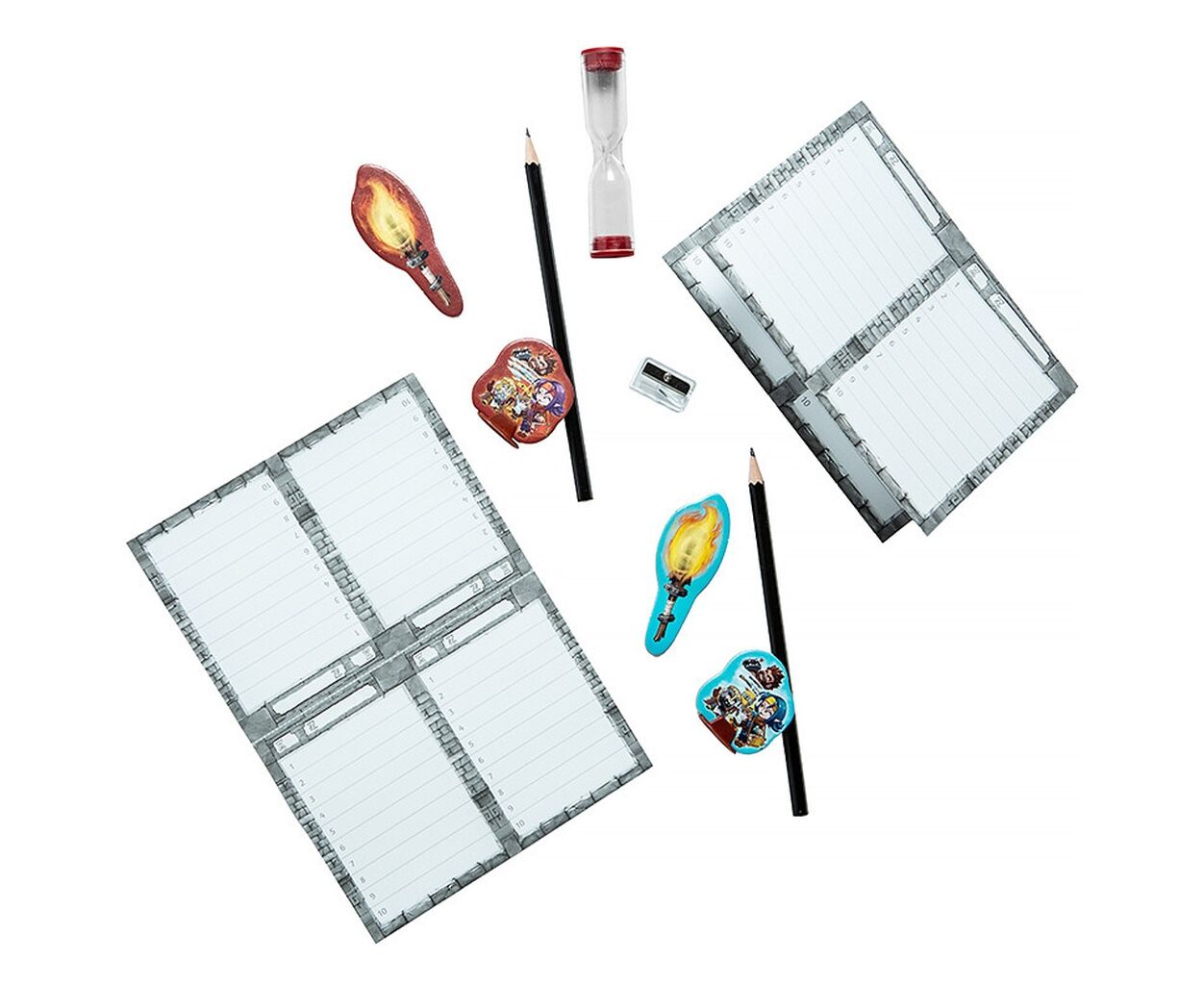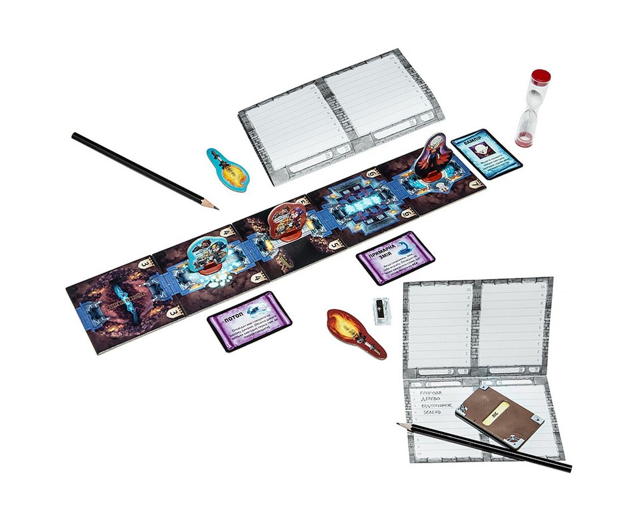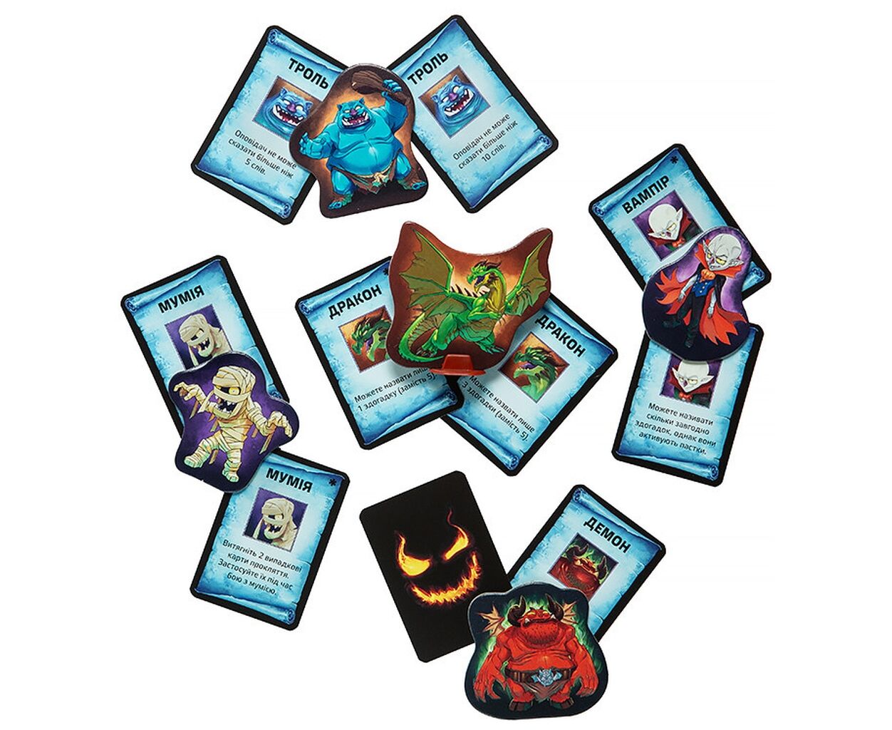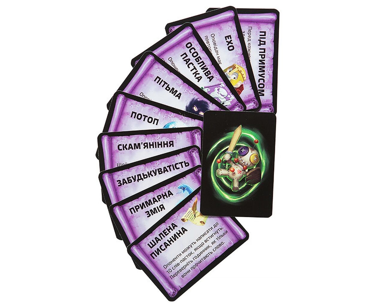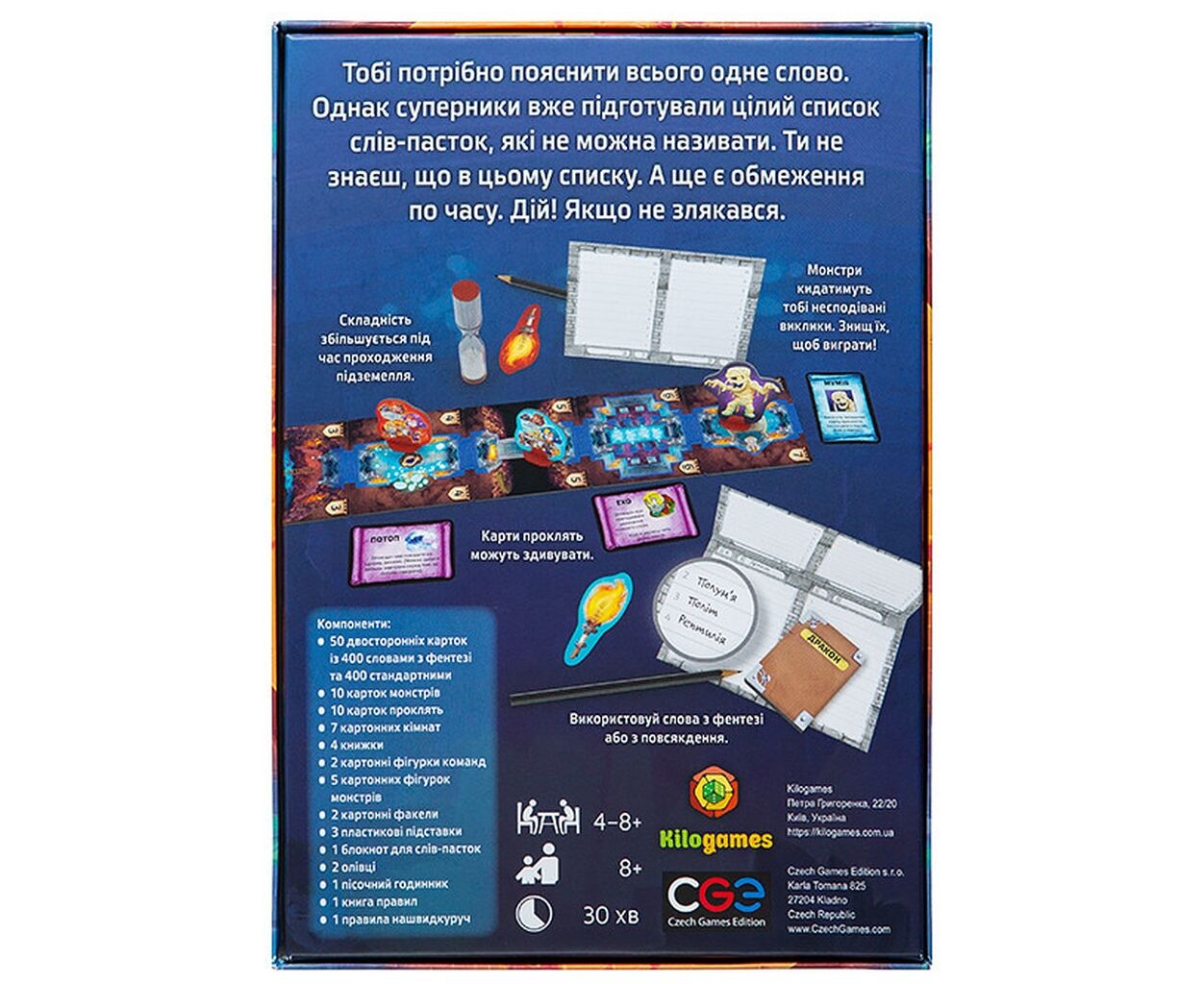 Комплектація гри вражає різноманіттям: 50 двосторонніх карт слів, карти монстрів та прокльонів, картонні фігурки та жетони, що дозволяють глибше зануритися в фентезійний світ. Зручний блокнот допоможе фіксувати слова-пастки, а пісочний годинник створить атмосферу напруги.Гра триває приблизно 30 хвилин, що робить її ідеальним варіантом для коротких, але насичених вечорів.