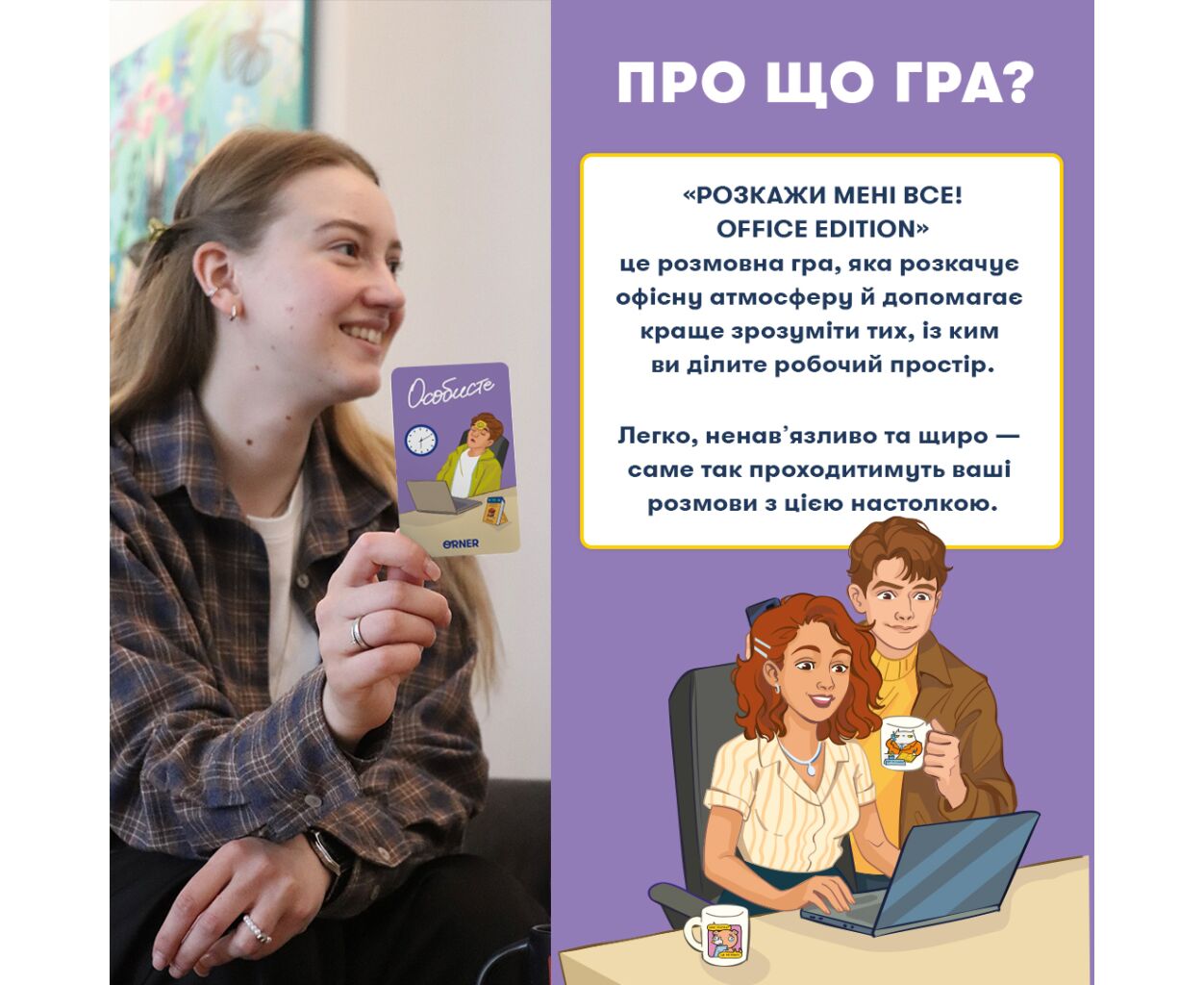 Опис Настільна гра Orner Розмовна гра Розкажи мені все! Office edition (укр.) (orner-3070)