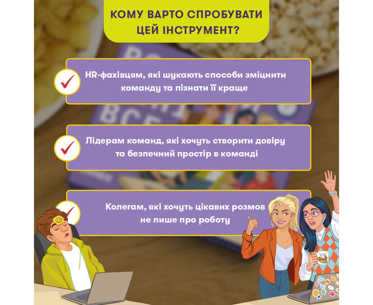 <б>Організуйте унікальні тімбілдінгб> заходи, ігри на корпоративі або просто веселі обіди з колегами. Відповідайте чесно, дізнавайтеся цікаві факти одне про одного та будуйте міцніші зв'язки. Правила гри дуже <б>простійб> — тягнути картки та відповідати на питання можна у <б>будь-якому порядку.
