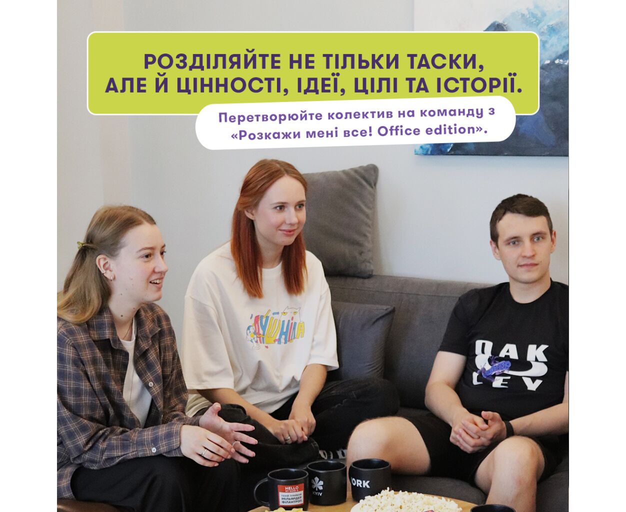Грайте у будь-який спосіб: окремо або всі разом — як вам більше подобається. «<б>Розкажи мені все! Office edition» стане вашим улюбленим способом провести час із колегами. Зробіть ваші розмови ще живішими та яскравішими українською мовою!