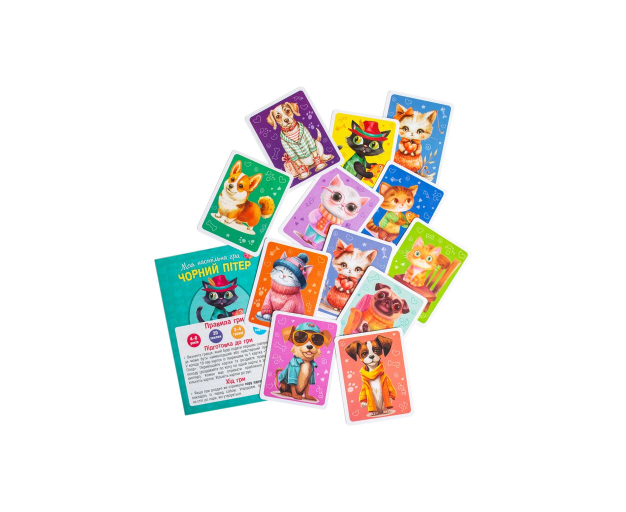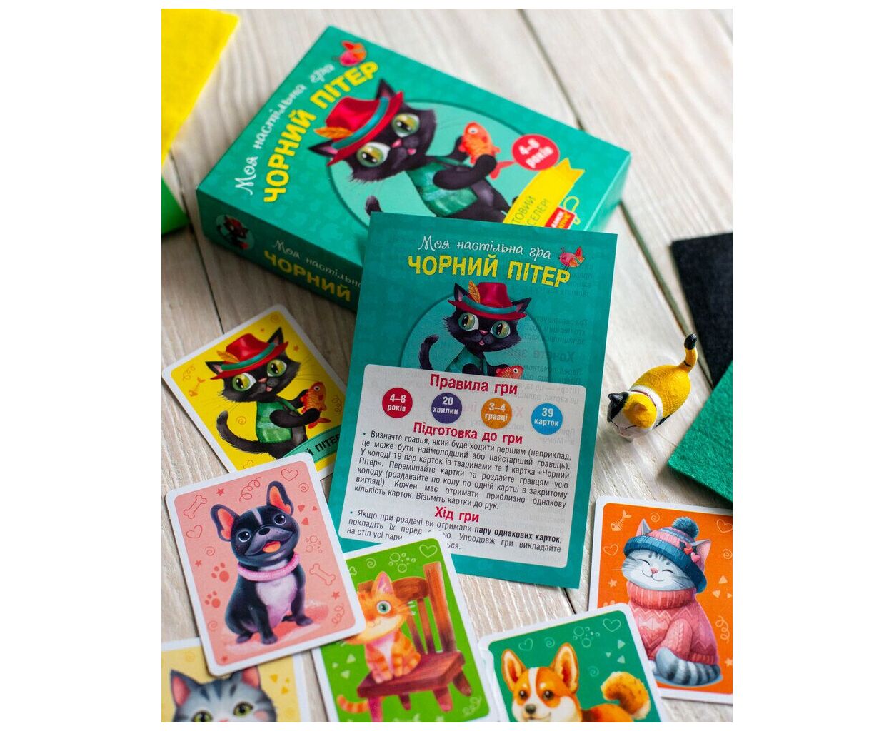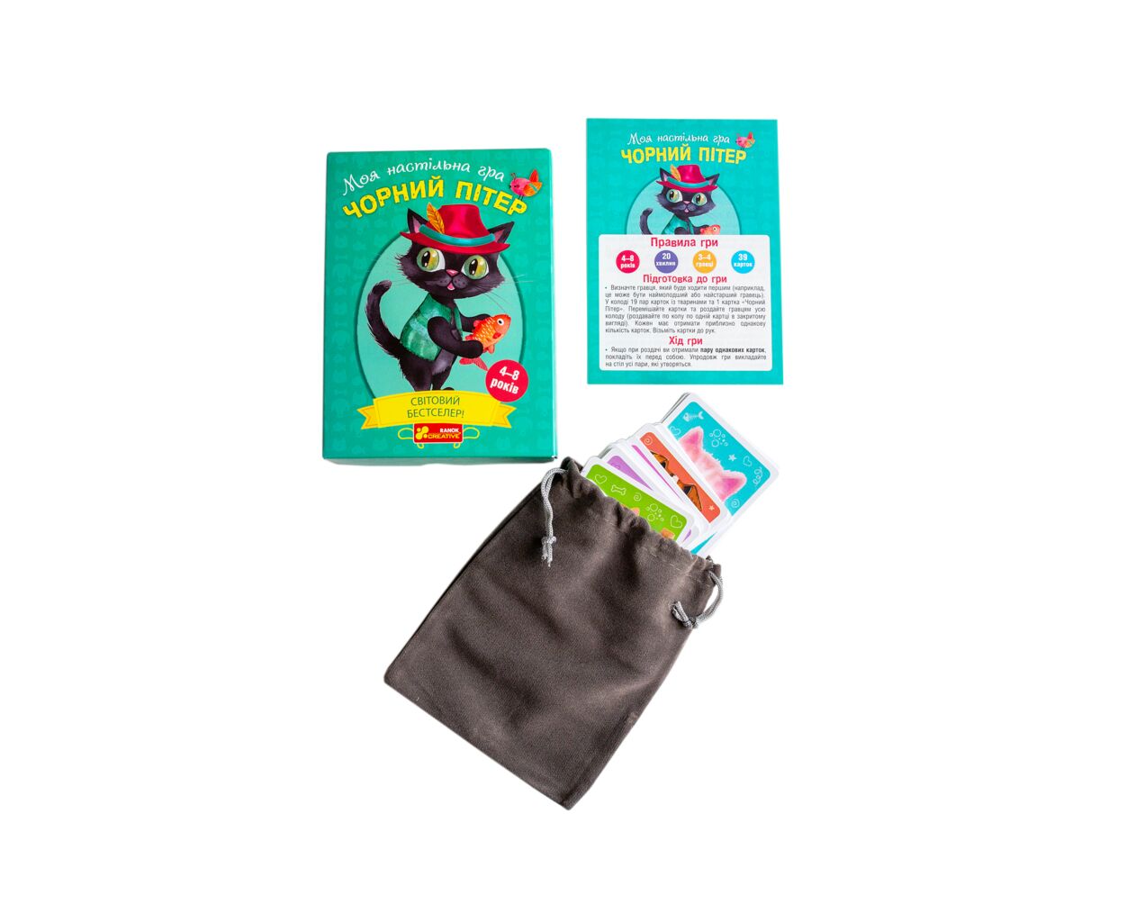 - 39 яскравих карток з тваринами, правила гри, мішечок для зберігання карт