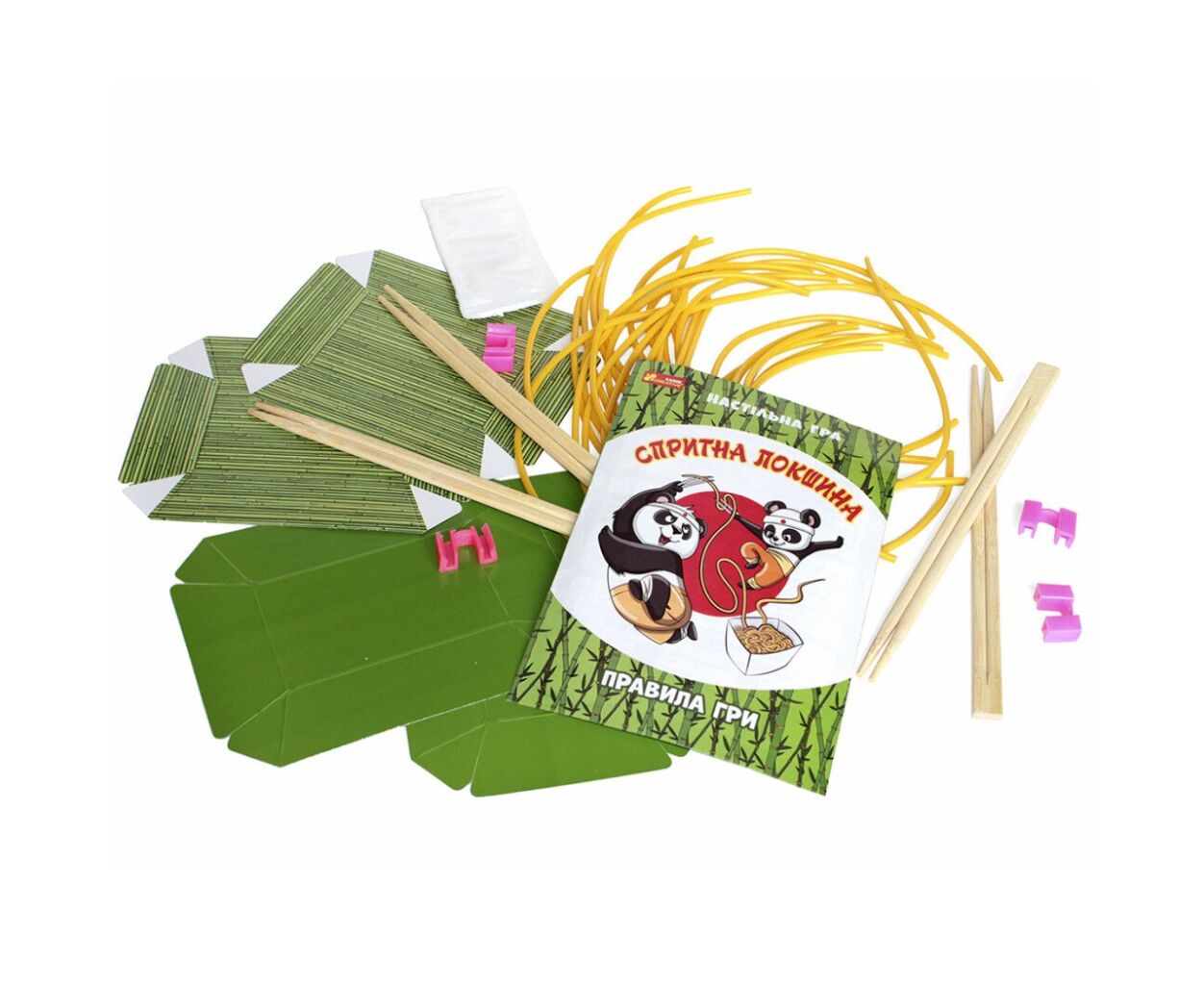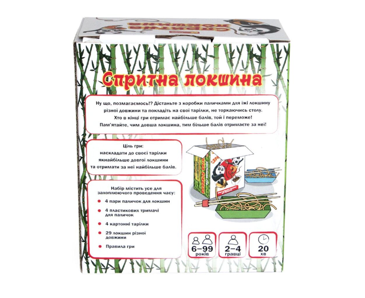 У комплекті ви знайдете 4 пари паличок для локшини, 4 пластикові тримачі для паличок, 4 картонні тарілки і 29 різної довжини локшин. Інструкція українською мовою легко пояснить правила, а ігровий процес триватиме лише 20 хвилин, що дозволяє швидко зануритися в гру, не витрачаючи зайвого часу.