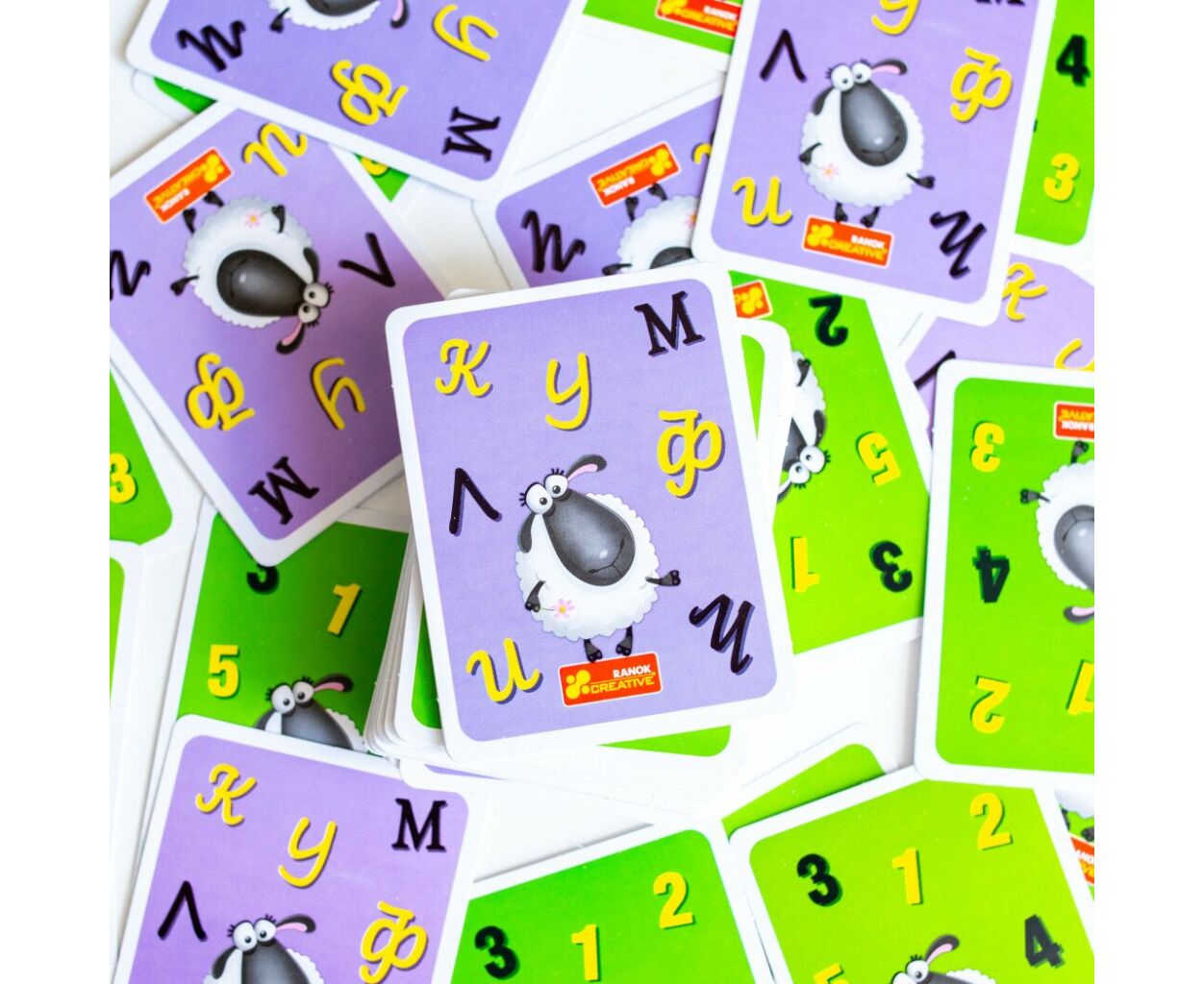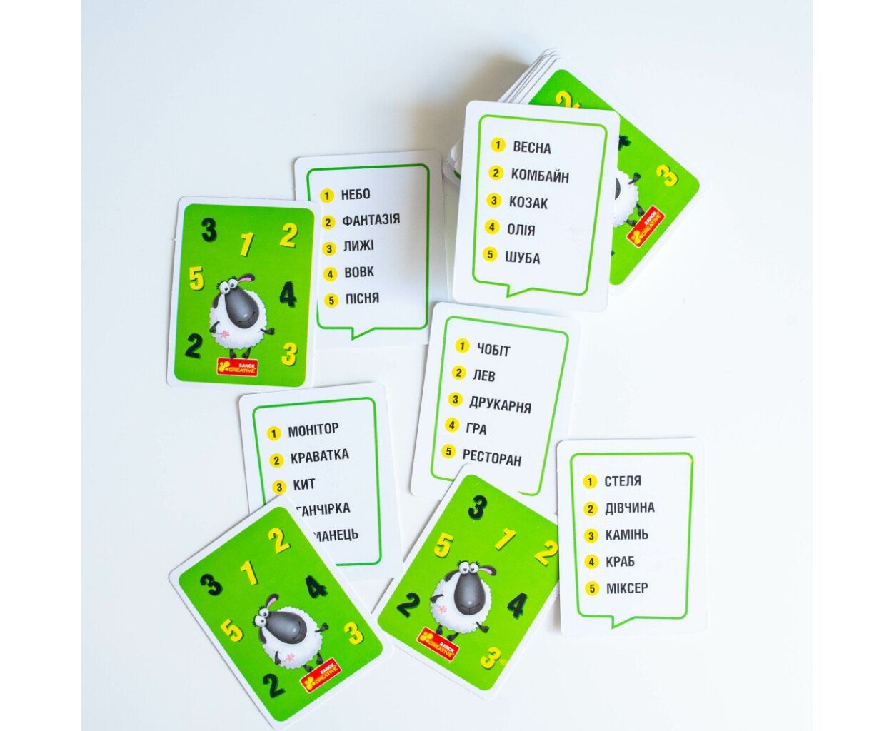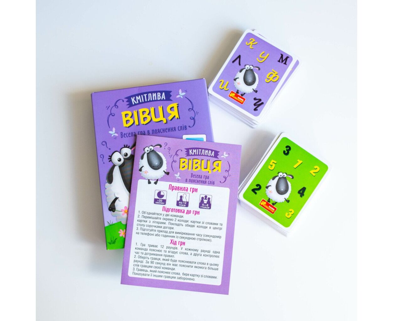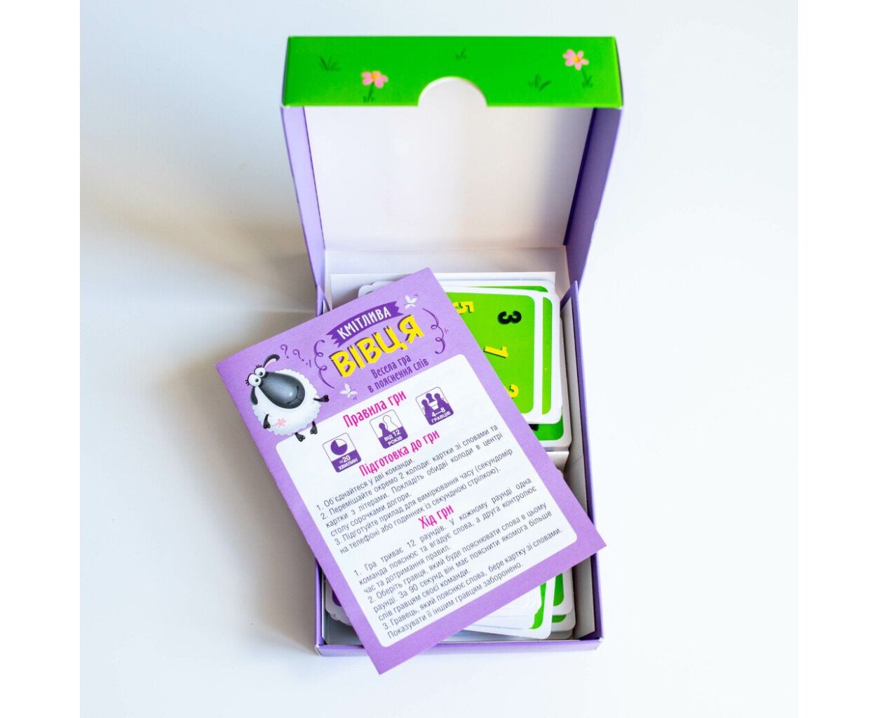 - картки зі словами - 76 шт., спеціальні карти - 4 шт., картки з літерами - 32 шт., правила гри