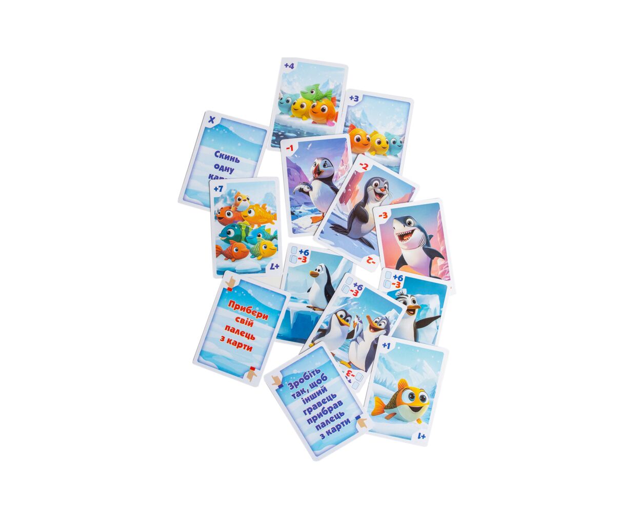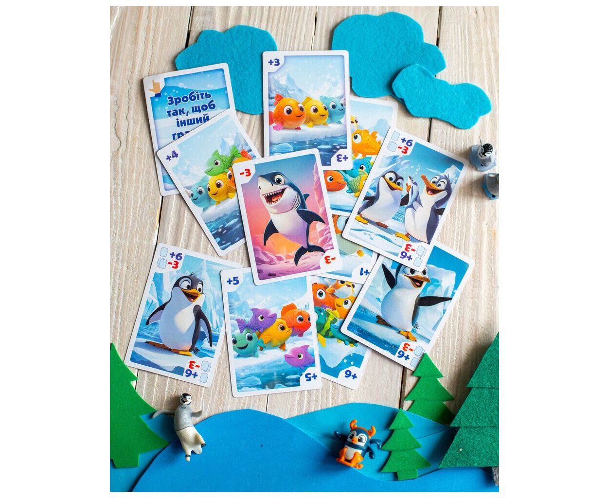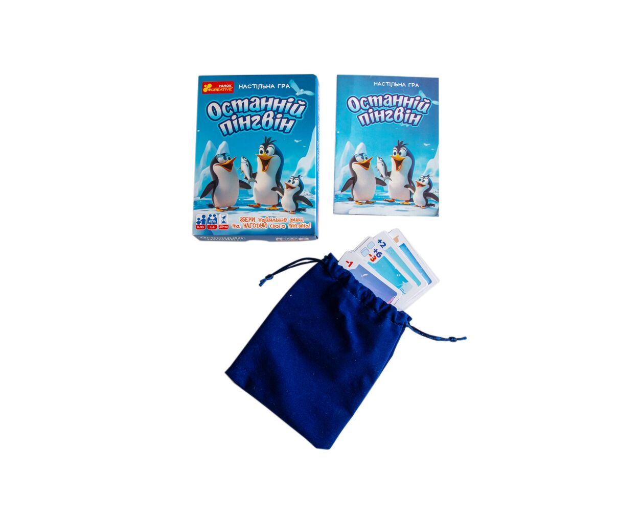 - 24 картки (7 з рибою, 5 з пінгвінами, 9 із завданнями, 3 хижаки); мішечок для зберігання карток.