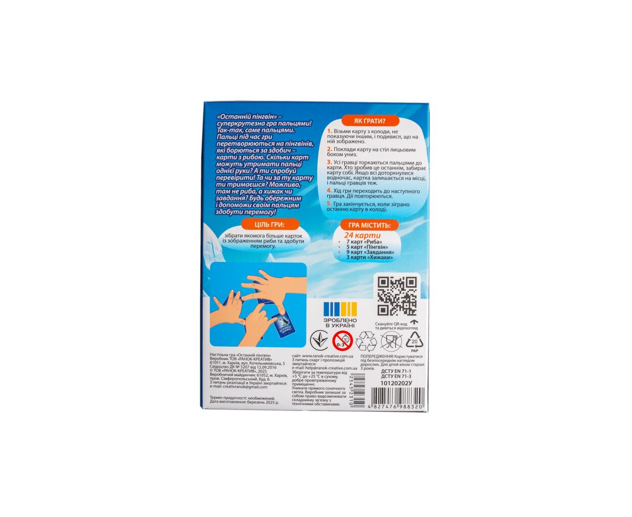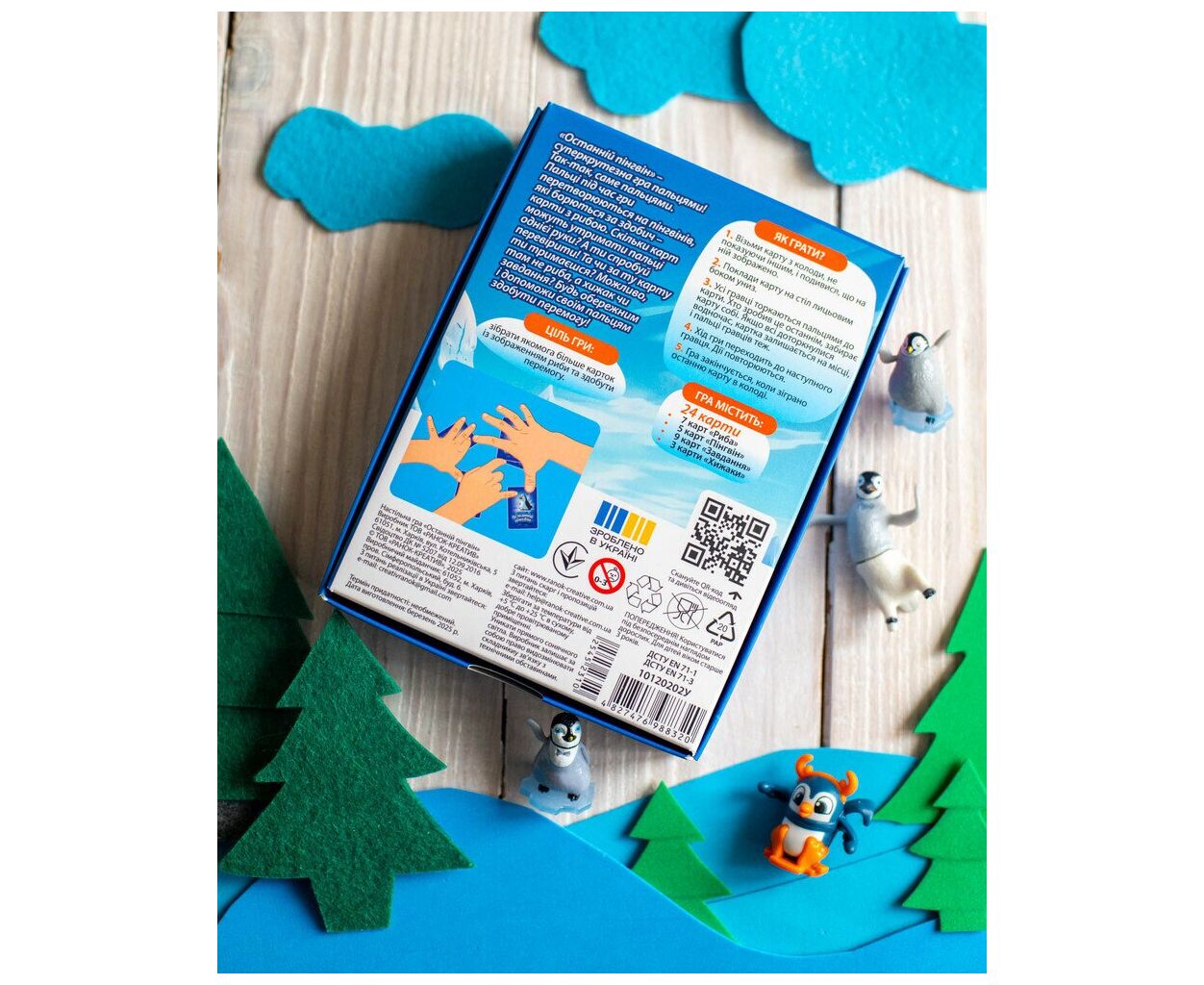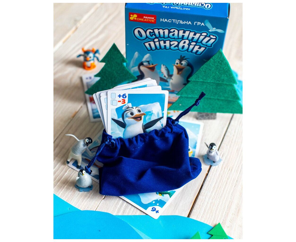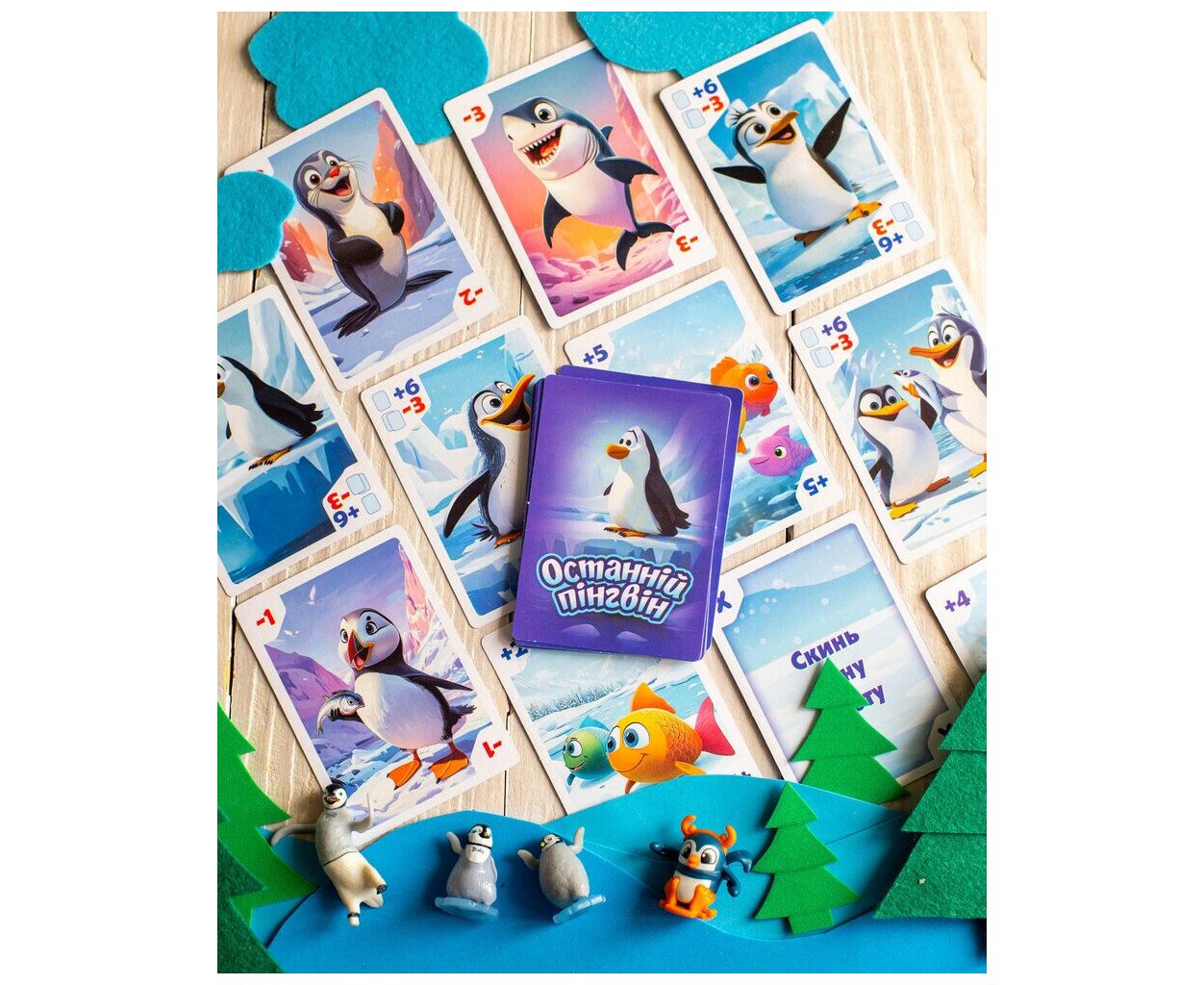 Комплектація гри включає 24 картки, які додають різноманітність у кожне коло: 7 карток з рибою, 5 з пінгвінами, 9 із завданнями та 3 хижаки. У набір входить також мішечок для зберігання карток, що спрощує організацію гри. Гра розрахована на компанію до 6 гравців, а почати свої пригоди з веселими пінгвінами можуть як діти від 8 років, так і дорослі, адже вона призначена для всієї родини.