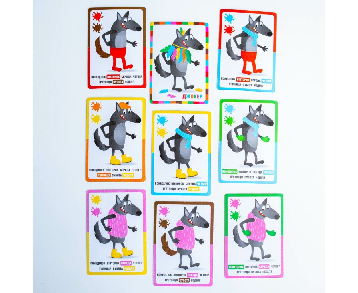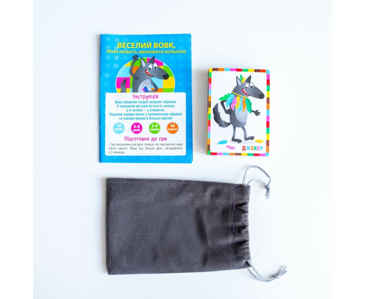 - 43 яскраві картки, велюровий мішечок для зберігання карт, правила гри
