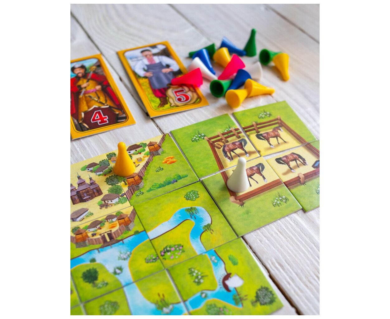 - 96 тайлів землі, 40 фішок-воїнів, 40 тайлів-персонажів, ігрове поле зі шкалою підрахунку балів, правила гри