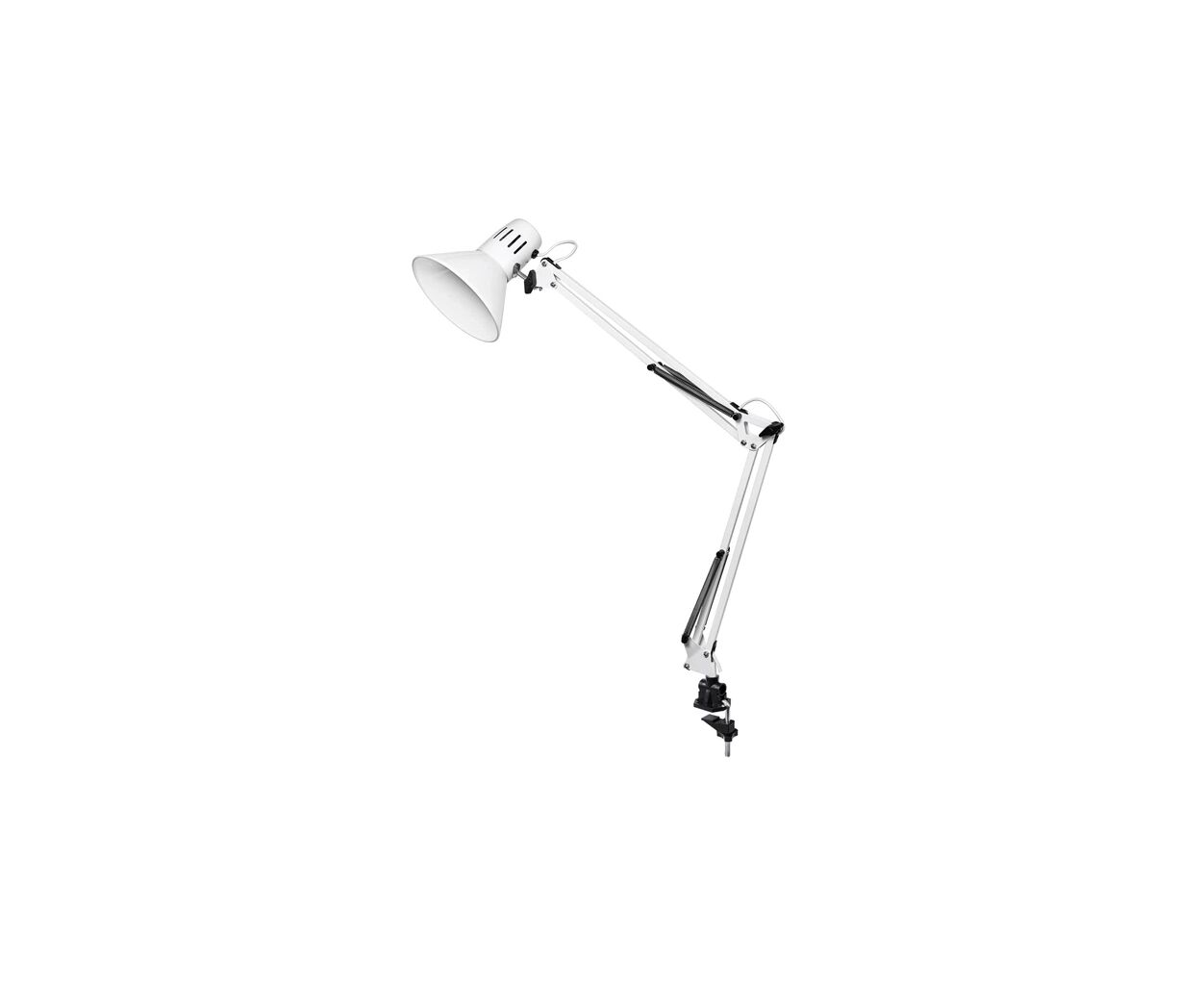 Стиль - класичні, Вид лампи - офісні, Тип лампи - світлодіодна (LED), лампа розжарювання, Кріплення - струбцина, змінна, Вимикач - кнопка на дроті, ні, ні, Матеріал - метал, Колір - білий