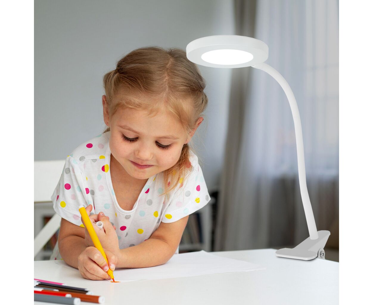 EUROLAMP LED Світильник настільний на прищіпці 6W 5000K білий. Дана модель світлодіодної настільної лампи від ТМ Eurolamp – освітлювальний прилад з можливістю регулювання яскравості. Пристосована для розміщення на робочому столі та призначена для його освітлення. Рухома конструкція світильника дозволяє скеровувати світло до потрібної ділянки та в потрібному напрямку. Включення/виключення світильника виконується за допомогою виключателя з клавішою, розміщеного на кабелі виробу. Перевагою даної моделі є спеціальна платформа утримування світильника – струбцина (прищіпка), за допомогою якої, прилад можна розмістити як в горизонтальному, так і вертикальному положенні.