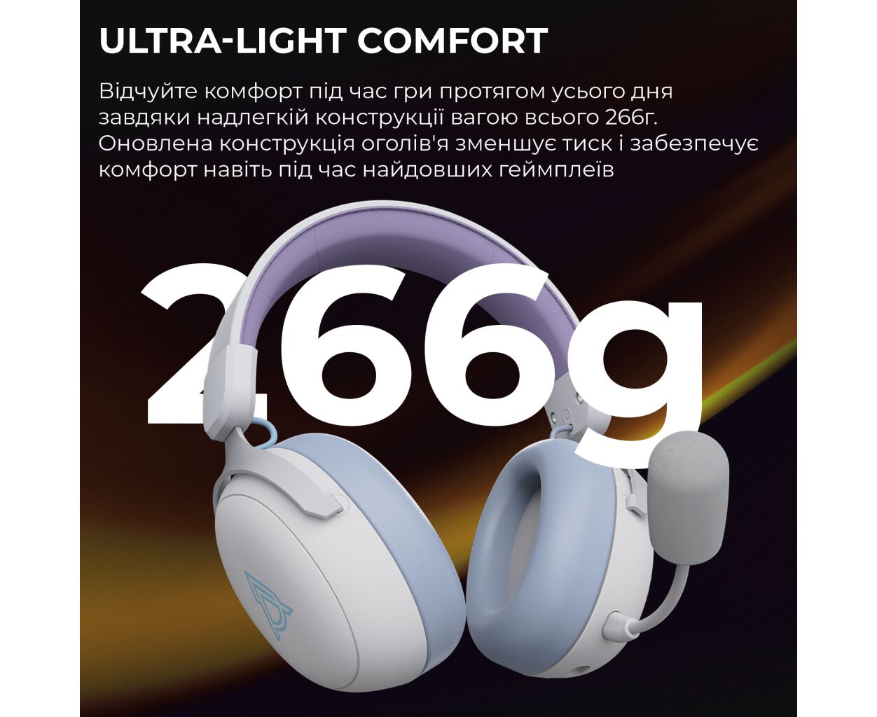 геймерські (ігрові), комбіноване, Jack 3.5 мм, Bluetooth, радіоканал, закриті, 64 Ом, чутливість - 115 дБ, 20 - 20000 Гц, з мікрофоном, Спрямованість мікрофона - всеспрямований, Версія Bluetooth - 5.3, 80 год, кількість jack(ів) - 1, кількість PIN (контактів) - 4, White, 266 г