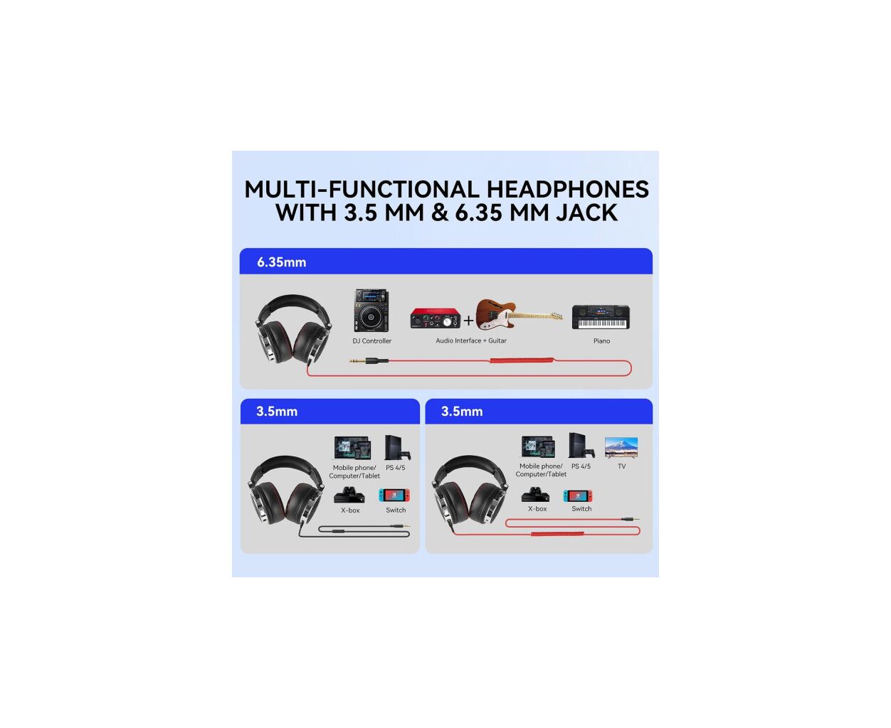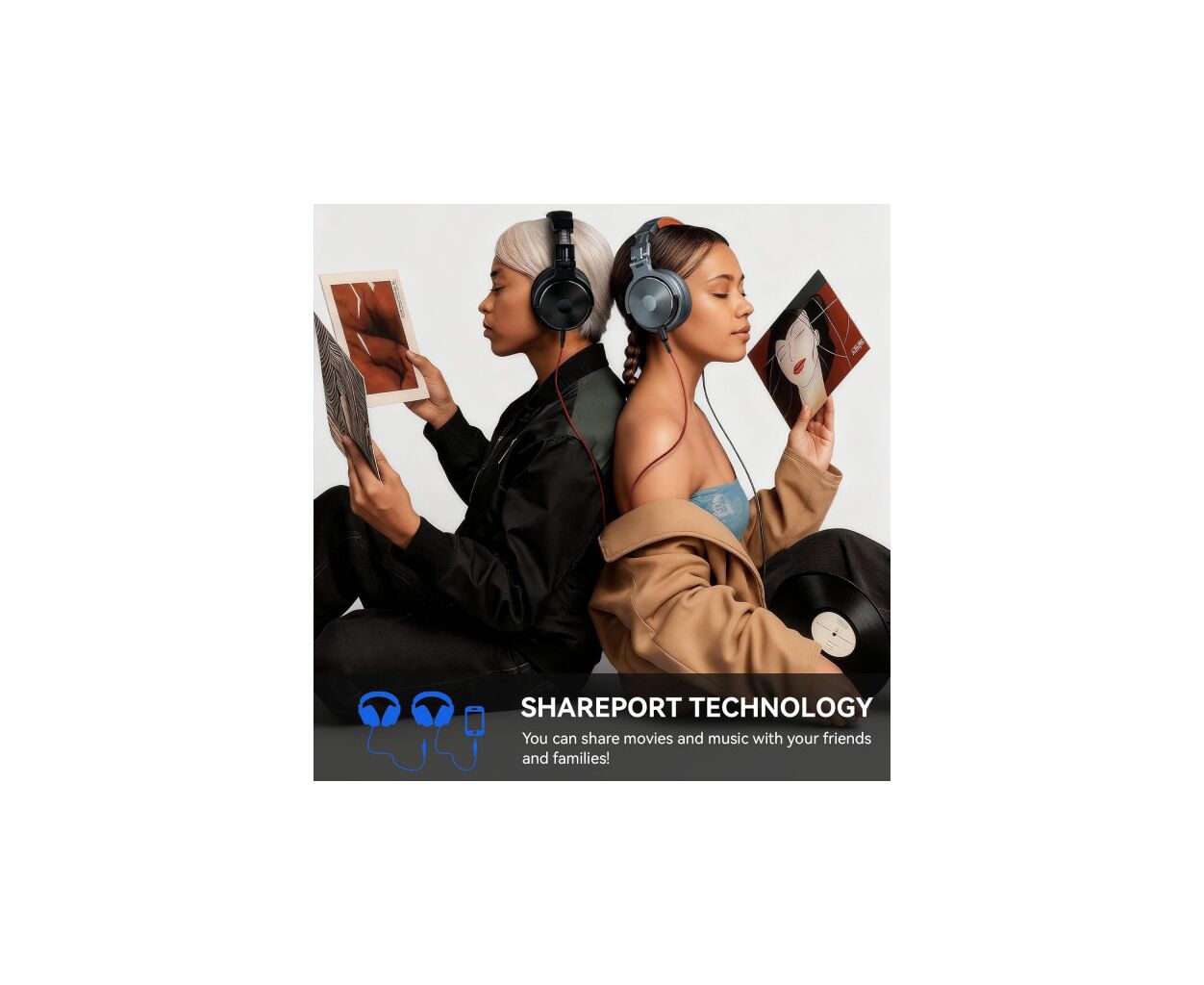 Навушники підтримують підключення через два аудіовходи: 3.5 мм та 6.35 мм. Це відкриває можливість для універсального використання з усіма типами аналогових джерел звуку. Окрім цього, позолочені штекери забезпечують бездоганну передачу аудіосигналу без втрат якості, а функція OneOdio Shareport дозволяє підключати дві пари навушників одночасно – тепер можна легко обмінюватися музикою з друзями без зайвого клопоту.